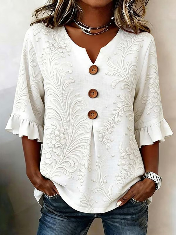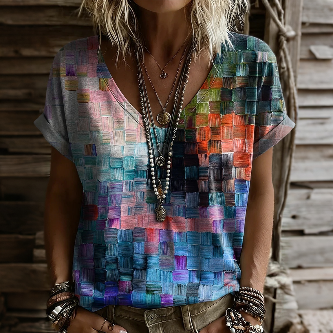 Women's Vintage Casual Jacquard Short-sleeve V Neck Top