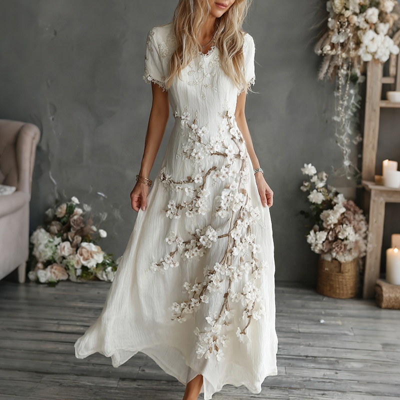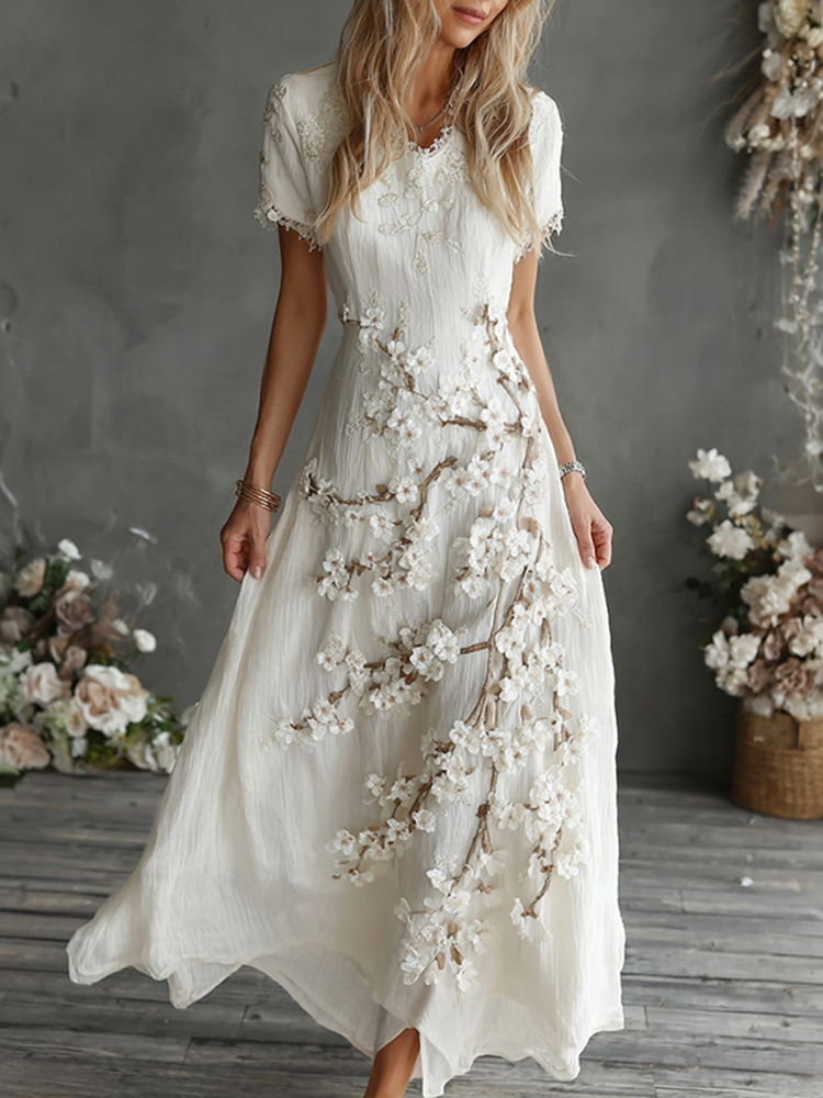 Women's Beautifully Embroidered Floral Print Short Sleeve Maxi Dress