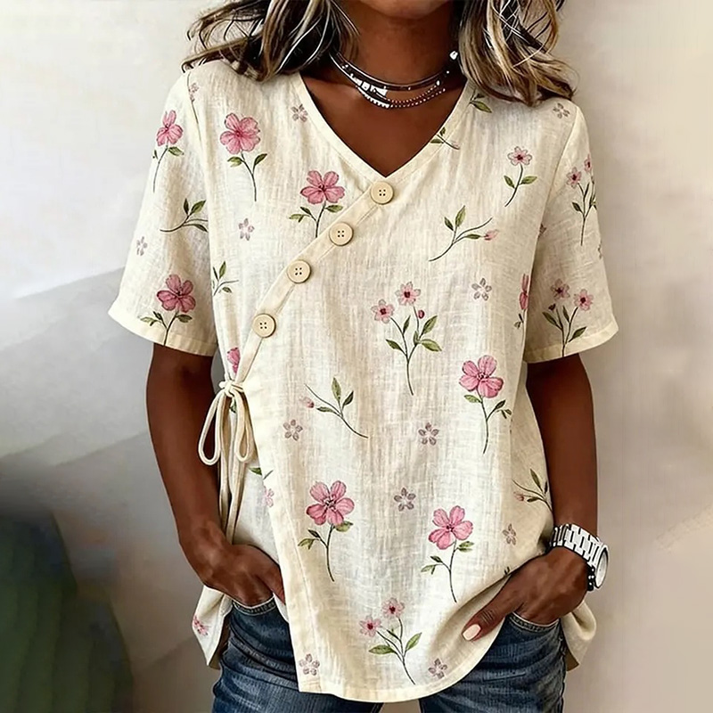 Women's Vintage Floral Print V Neck Linen Blend Short Sleeve T-shirt