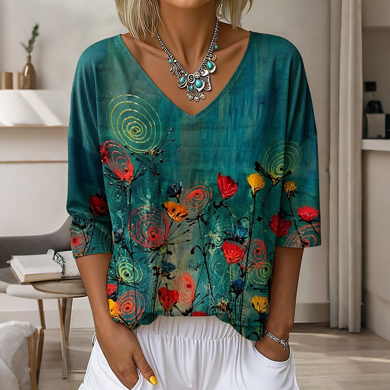 Women's Vintage Floral Pattern Art Print Flowy Linen Blend Three-quarter Sleeve V Neck Linen Tops