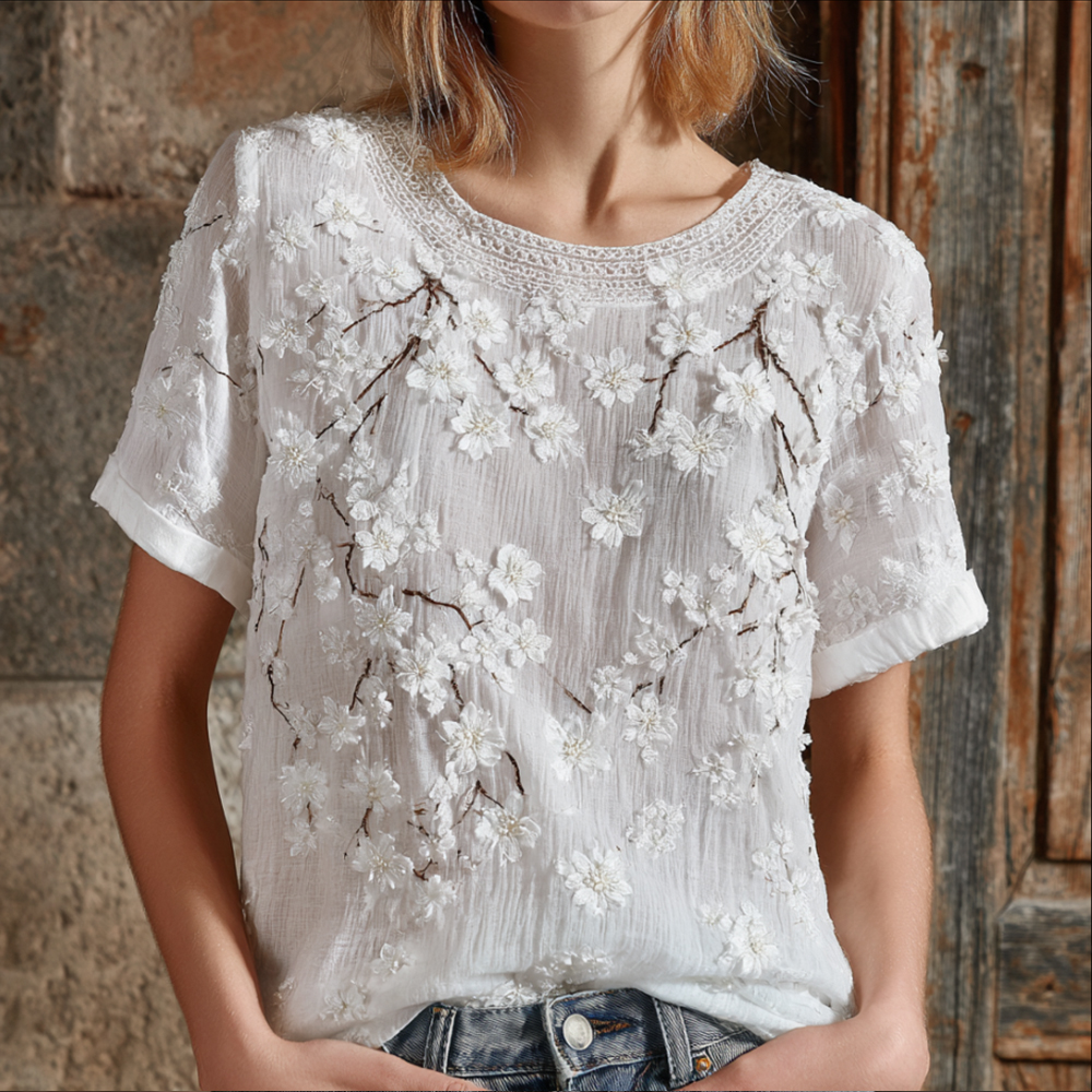 Retro White Cherry Blossom Art Embroidered Linen Blend Crew Neck Short Sleeve Top