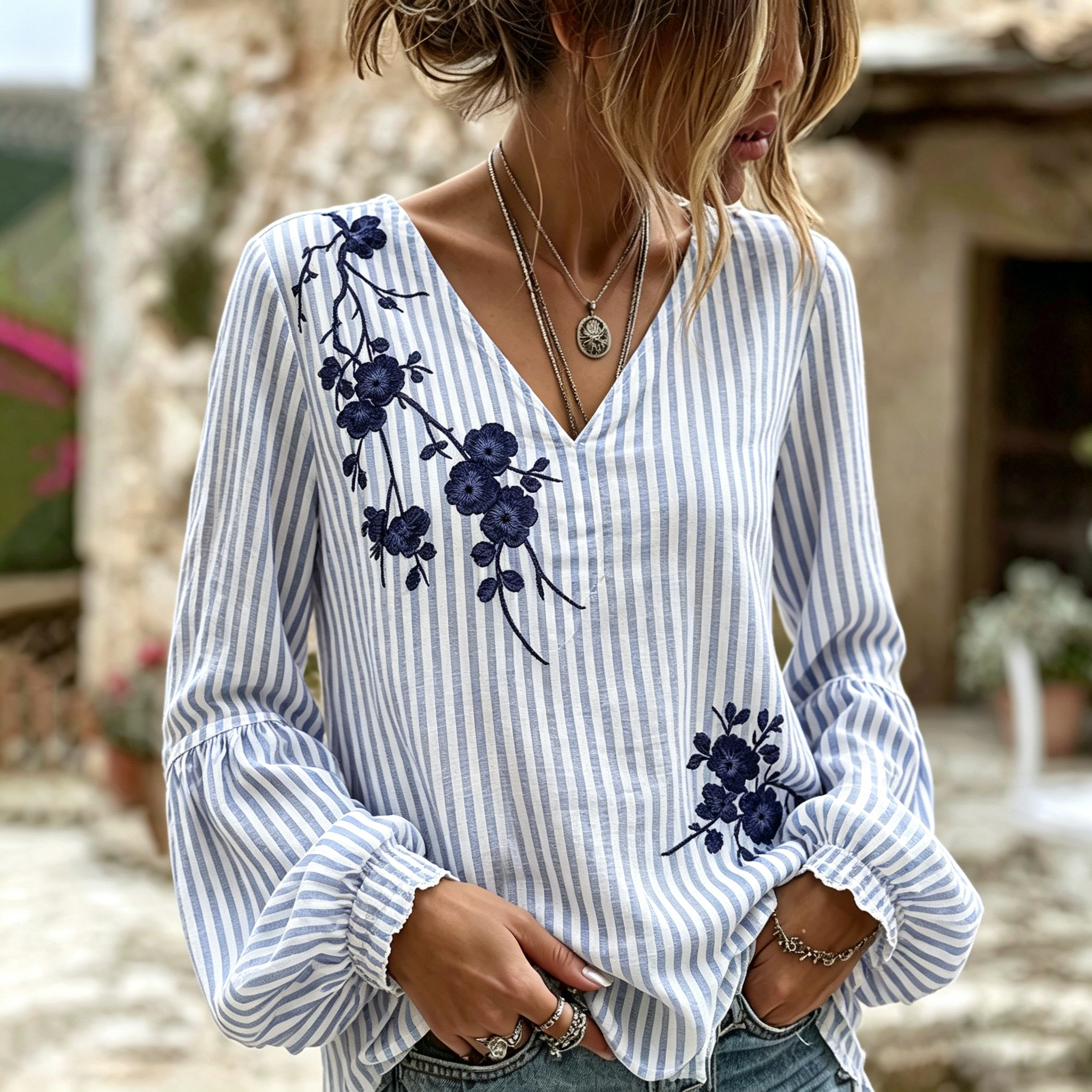Vintage Plum Bossom With Stripe Art Casual V Neck Linen Tops