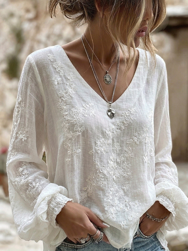 Women's Vintage Floral Embroidery Art V-neck Linen Blend Short Sleeve Top