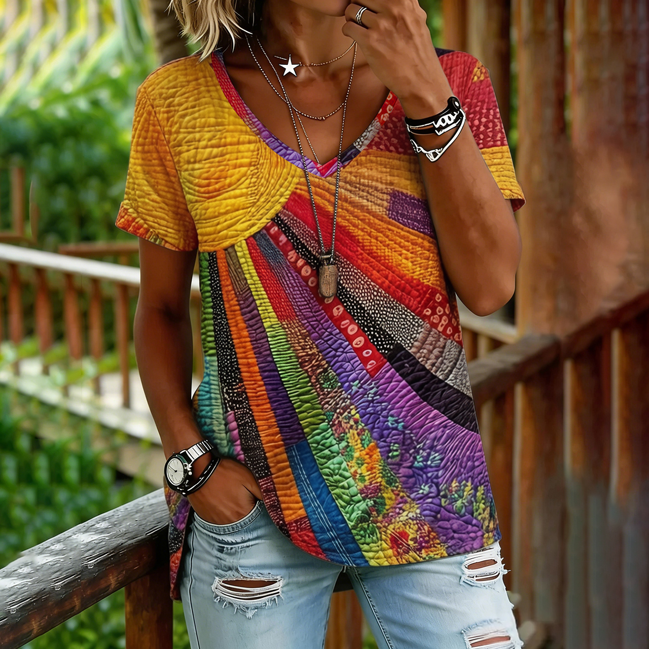 Women's Colorful Sun Collage Art Print Short Sleeve V Neck Tshirt