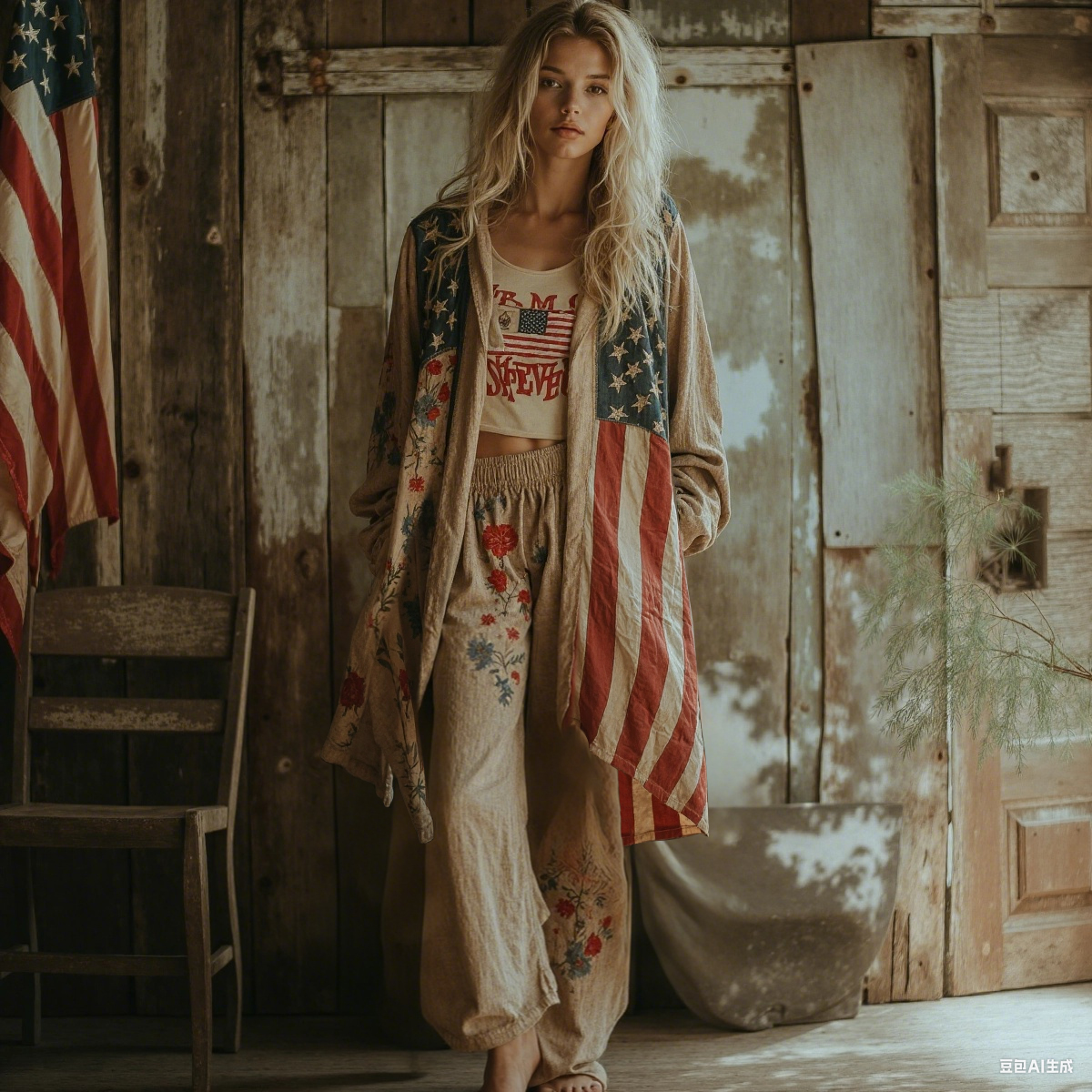 Women's Vintage Independence Day Flag Patchwork Art Print Linen Blend T-shirt