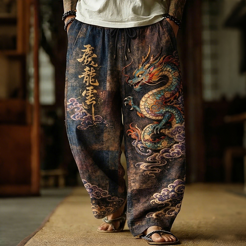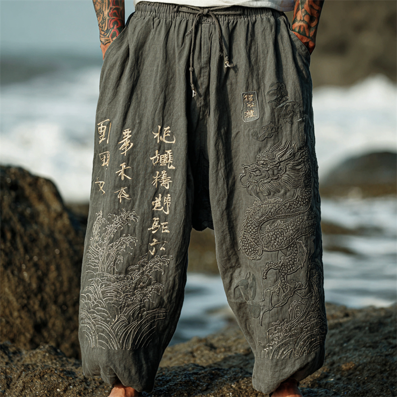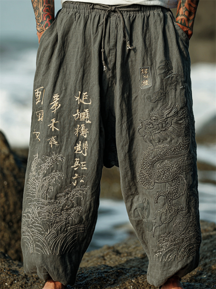 Men's Dragon & Sea Waves Japanese Calligraphy Art Linen Pants