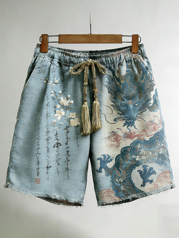 Men's Retro Floral Calligraphy And Dragon Pattern Art Casual Shorts