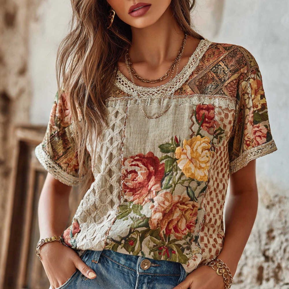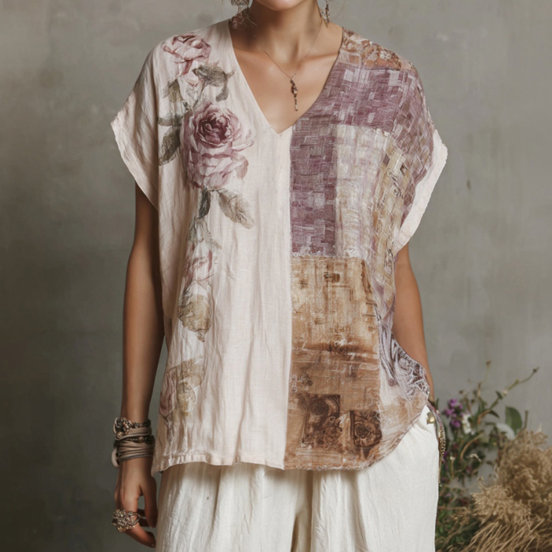 Women's Vintage Patchwork Art Print Flowy Linen Blend Casual Tops
