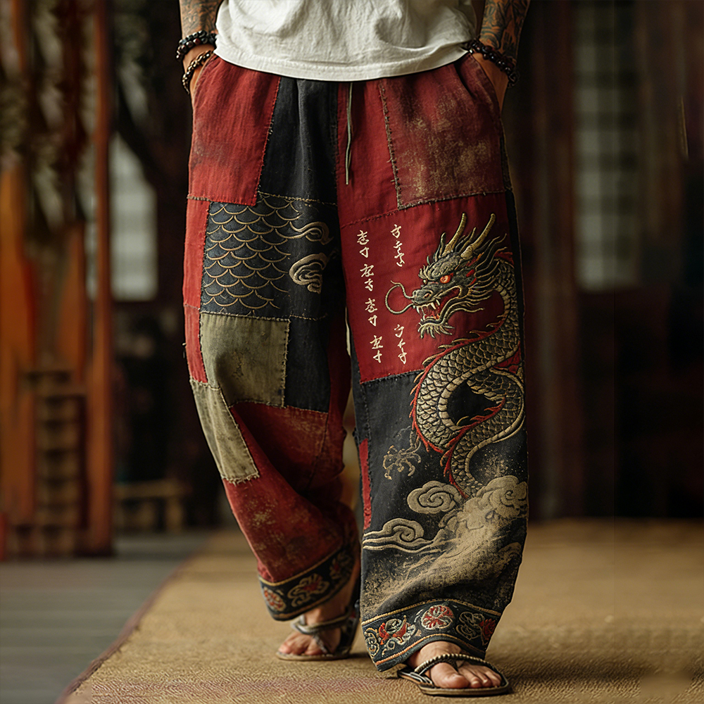 Men's Japanese Dragon And Calligraphy Patchwork Art Linen Casual Pants