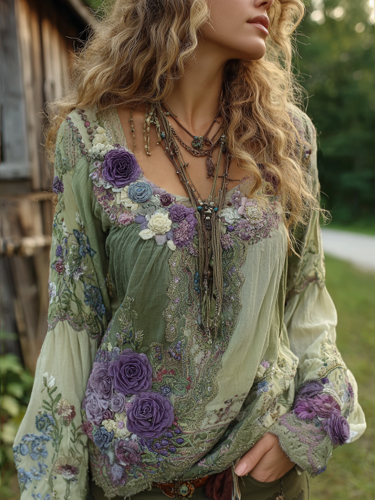 Vintage Purple Lavender And Floral Embroidered Linen Long Sleeve Shirt