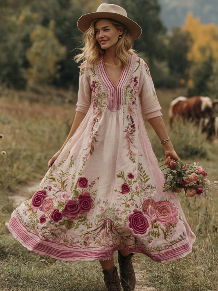 Women's Floral Embroidery Art V Neck Comfy Midi Dress