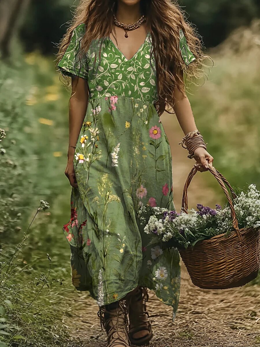 Women's Vintage Wildflower Art Linen V-neck Dress