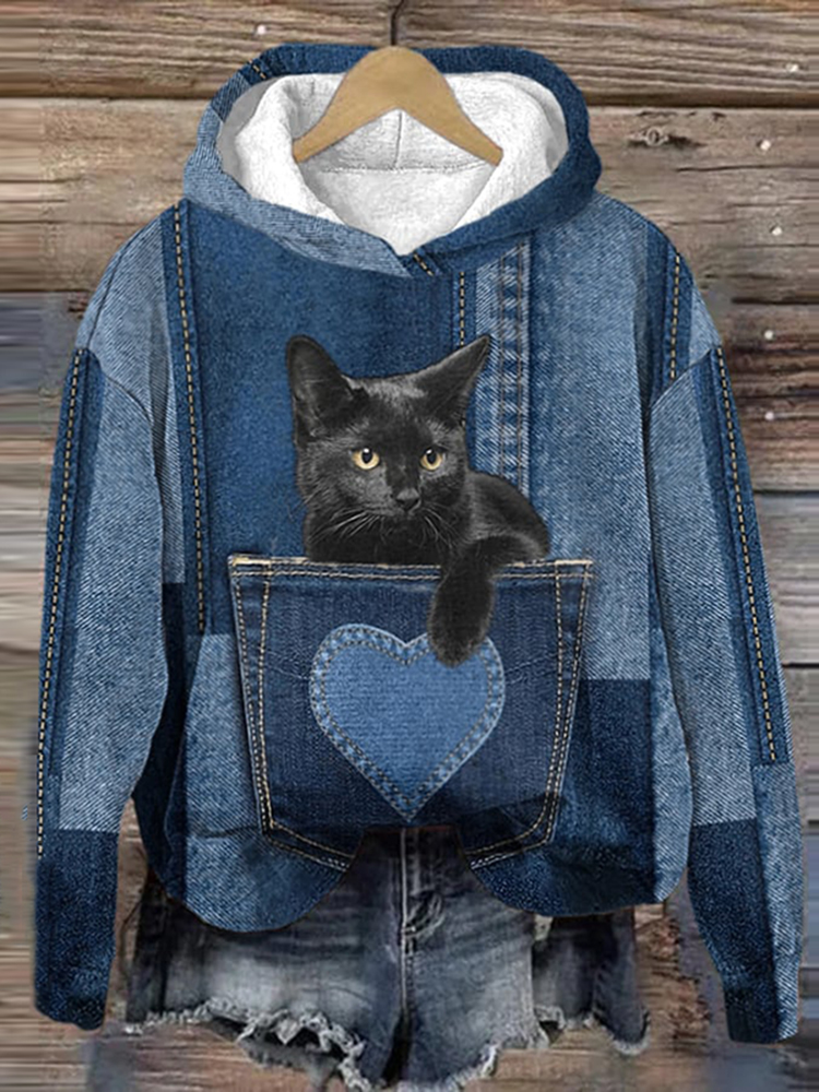 Women's Cute Cat Paw Denim Patchwork Art Casual Top
