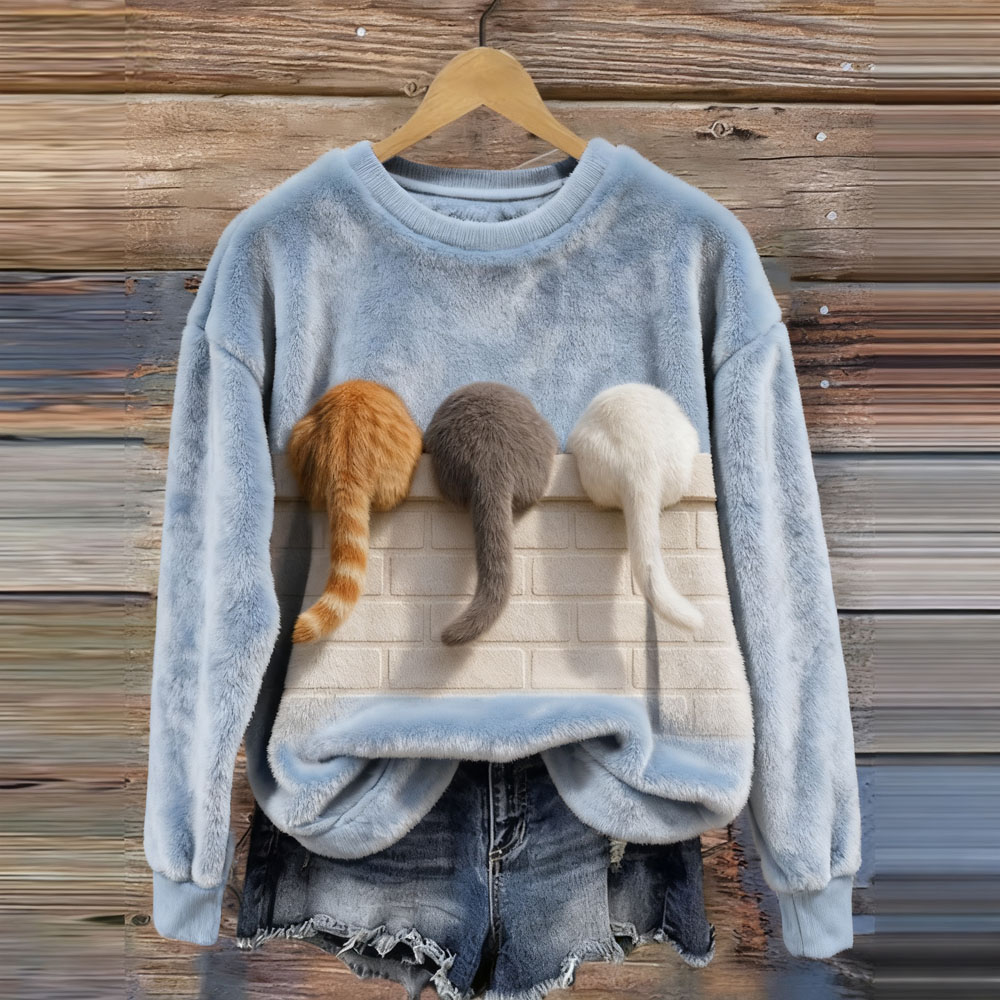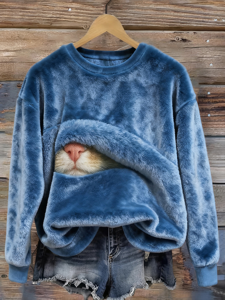 Women's Christmas Cat Embroidery Art Comfort Plush Sweatshirt