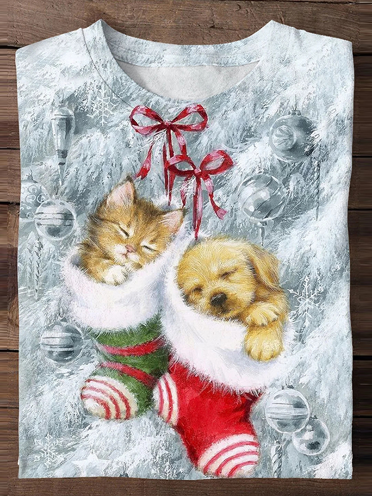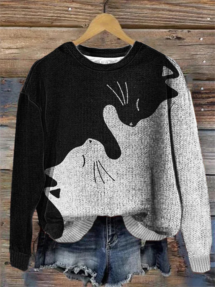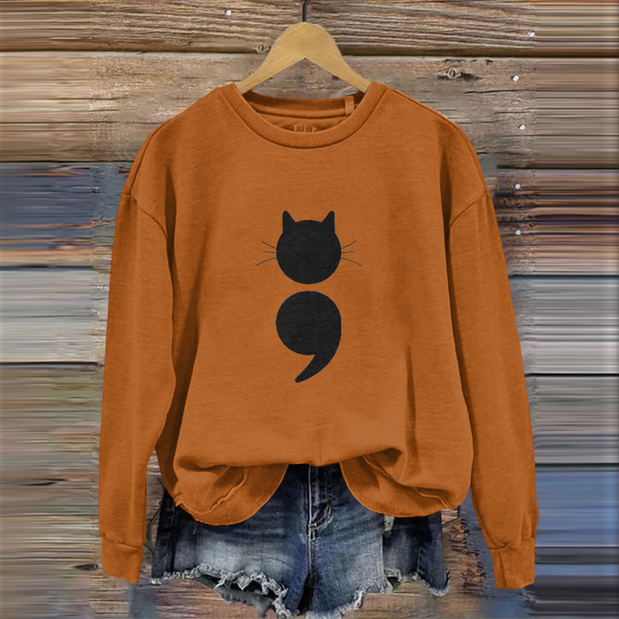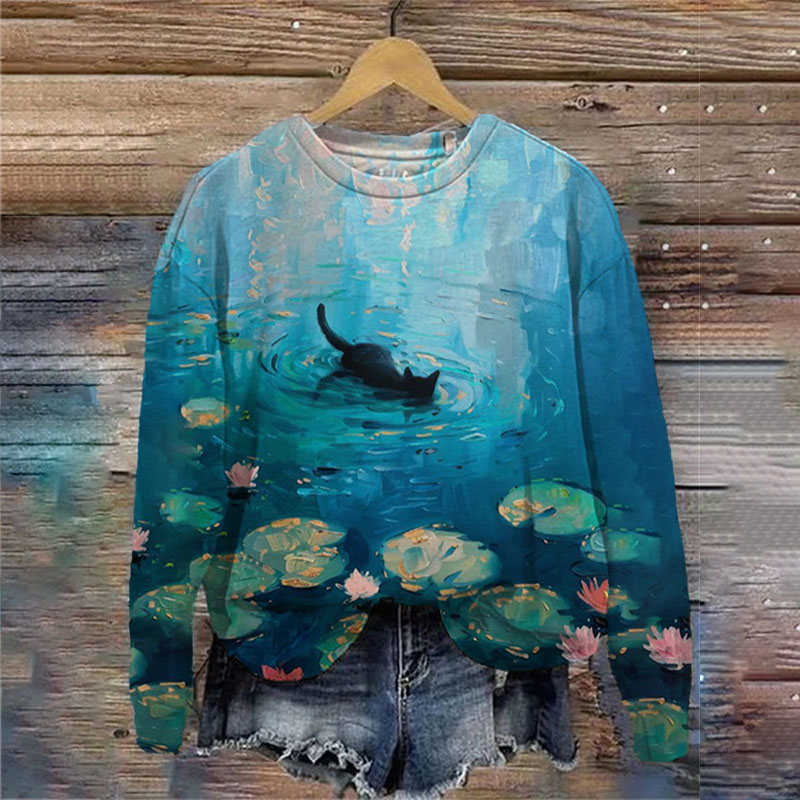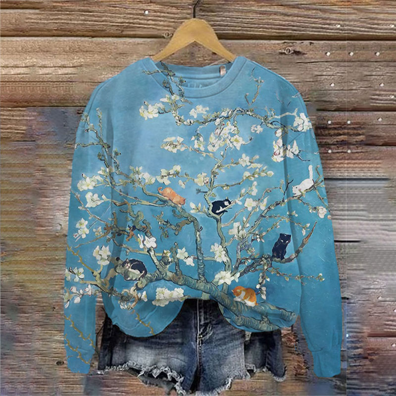 Cute Cat Print Round Neck Long Sleeve Sweatshirt