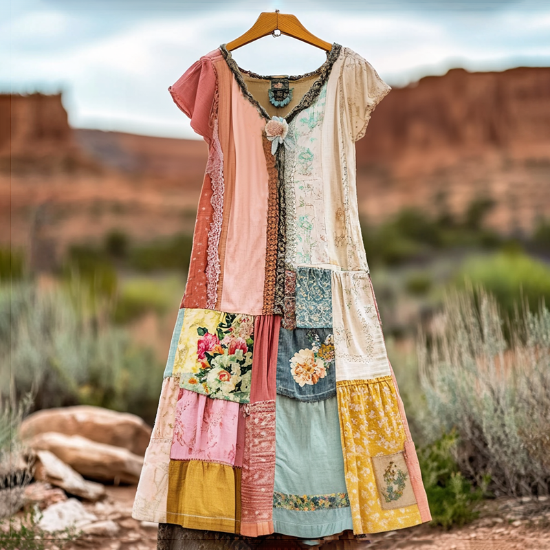 Women's Vintage Floral Patch Comfort Short Sleeve V Neck Dress
