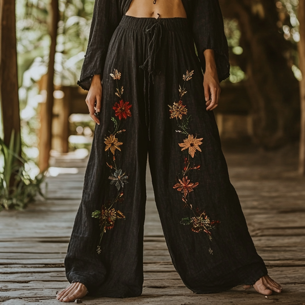 Vintage Bohemian Holiday Style Floral Ethnic Totem Art Printed Cotton Linen Wide Leg Pants