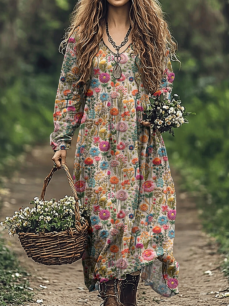 Vintage Boho Flowers Embroidered Linen Blend Maxi Dress