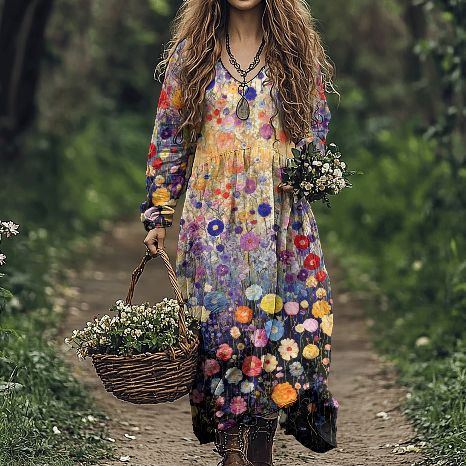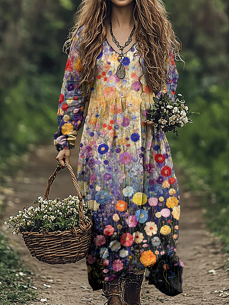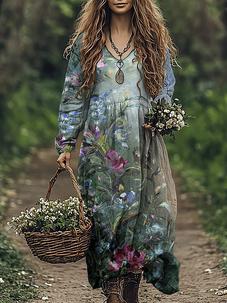 Vintage Floral Oil Painting Art Linen V-neck Dress