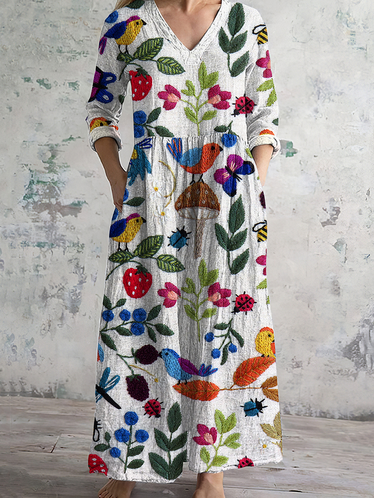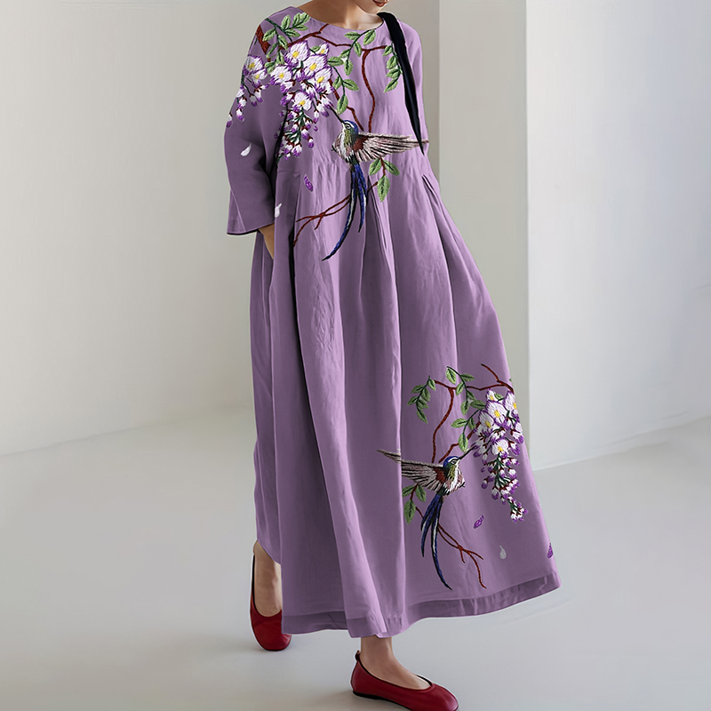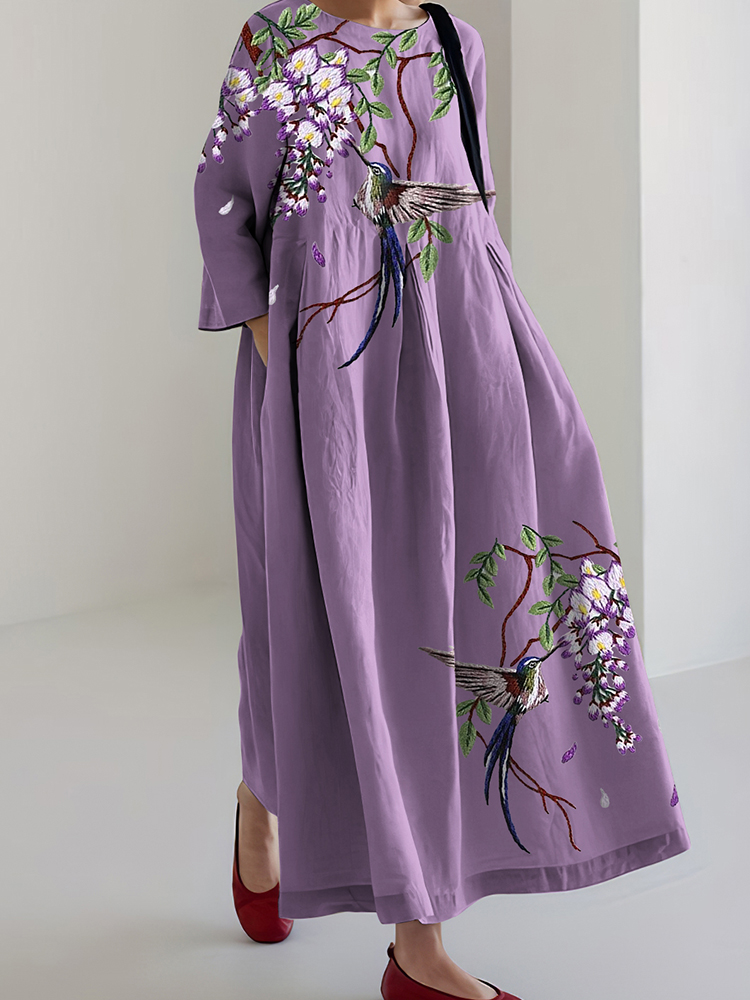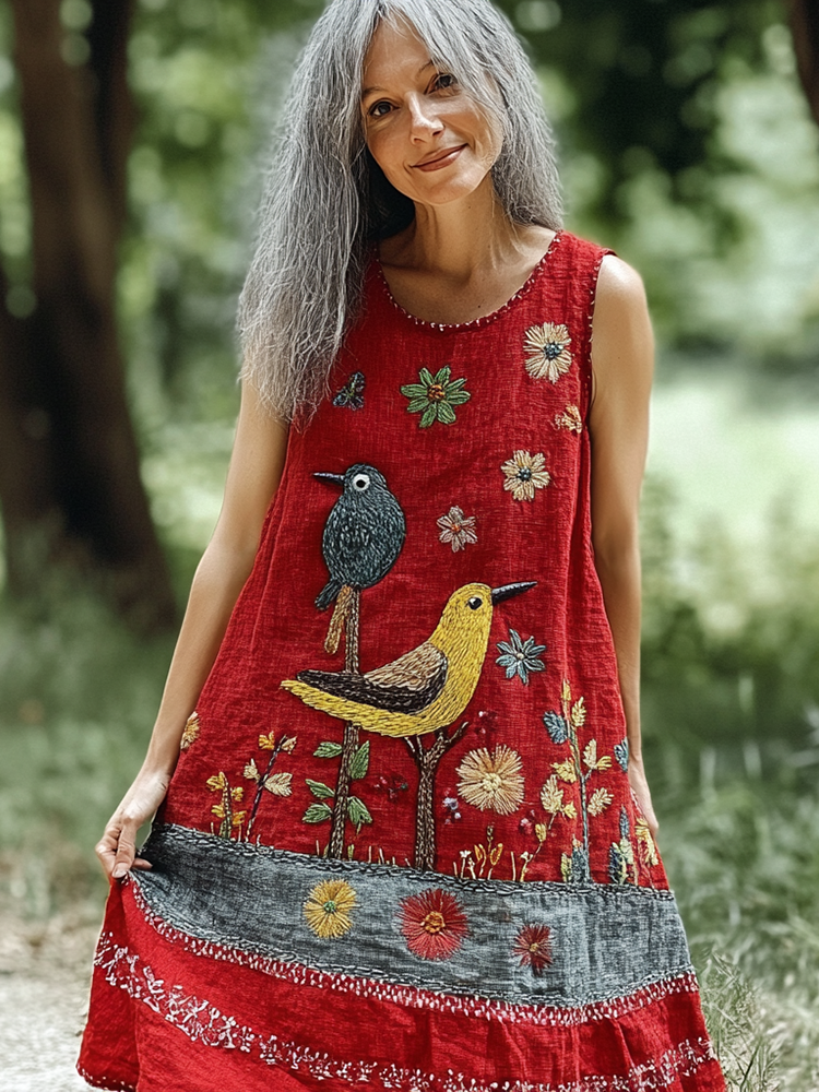 Flower And Bird Embroidery Art Print Loose Midi Dress