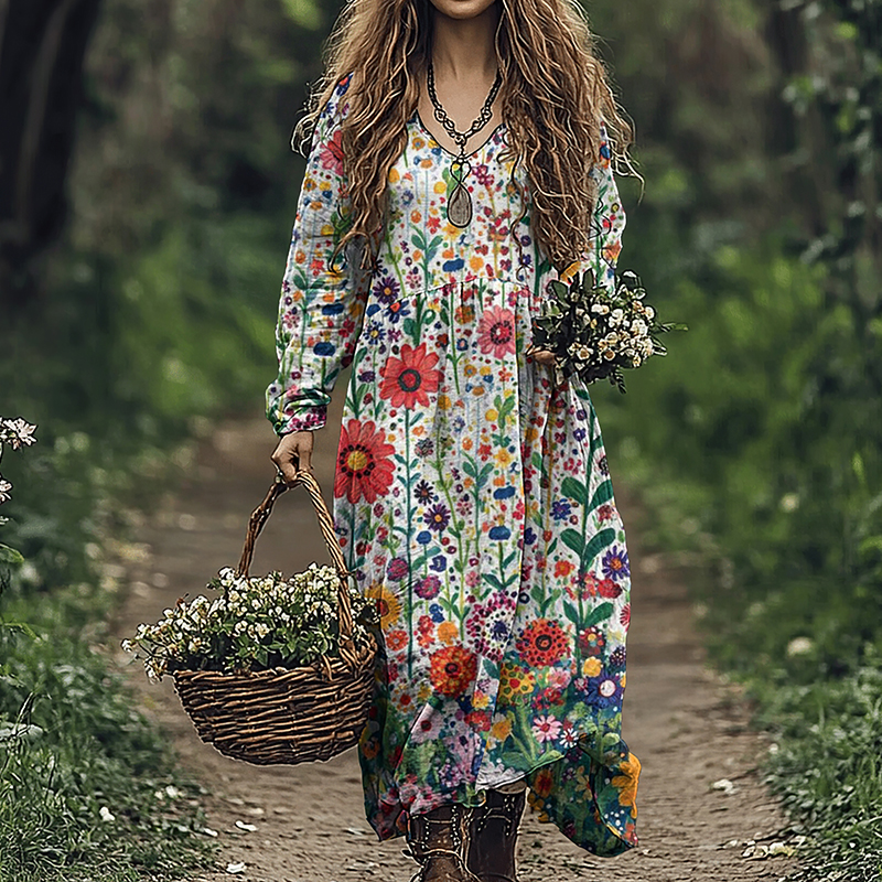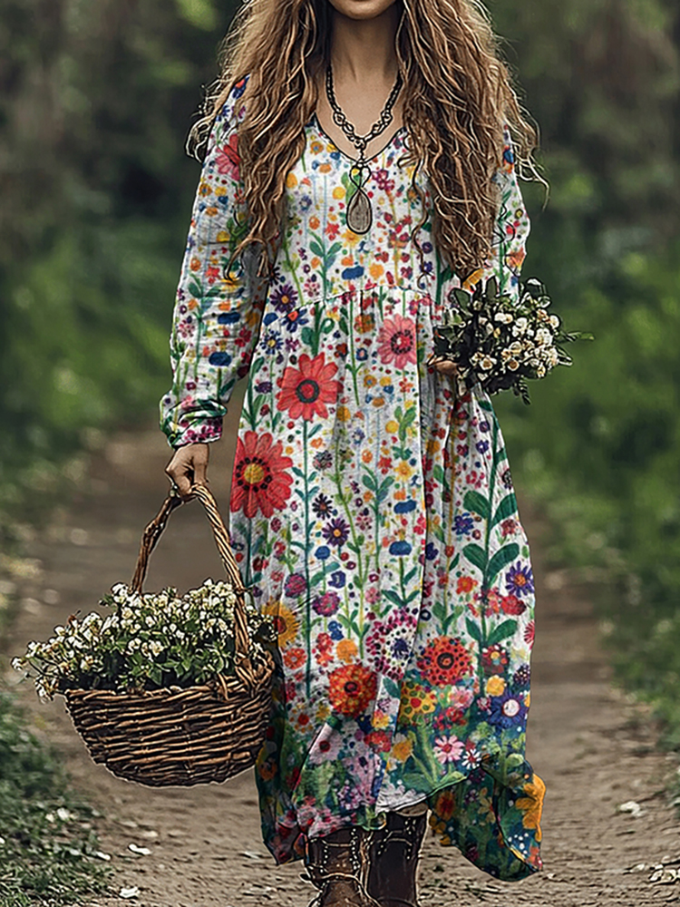 Women's Pastoral Floral Art Print Casual Cotton Linen Midi Dress