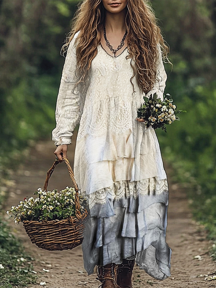 Vintage Floral Lace Layered Flowy Linen Blend Maxi Dress