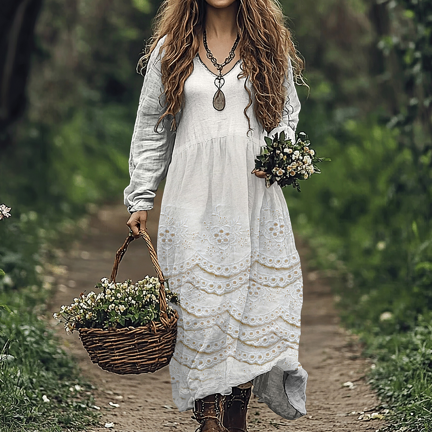 Floral Lace Embroidery Art Linen Blend Maxi Dress