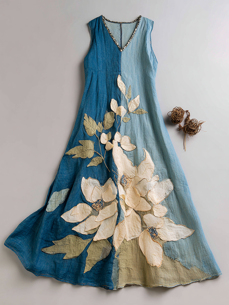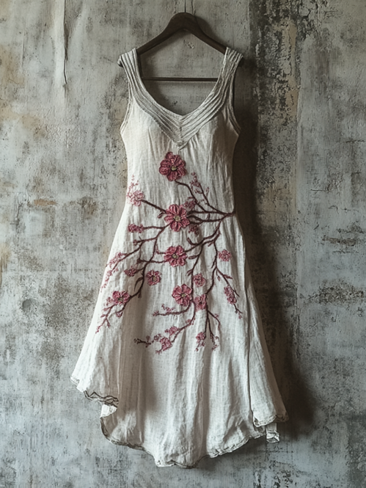 Women's Vintage Floral Embroidery Contrast Color Linen Sleeveless Dress