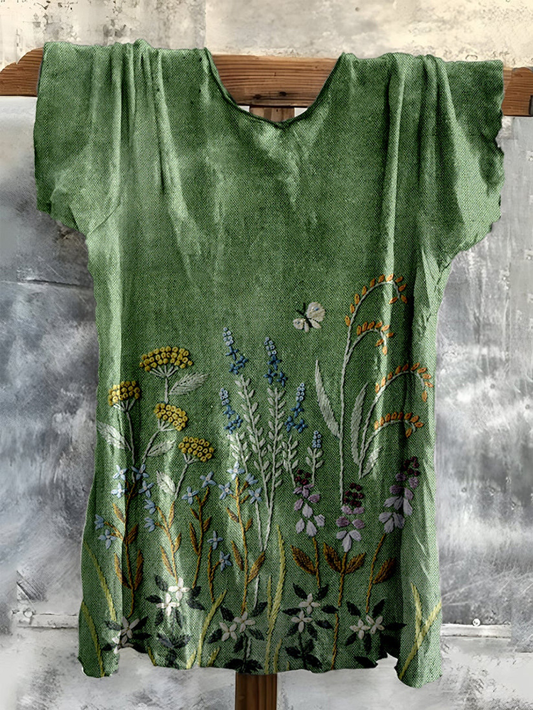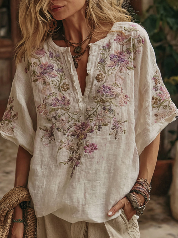 Vintage Embroidered Floral Art Cotton T-shirt