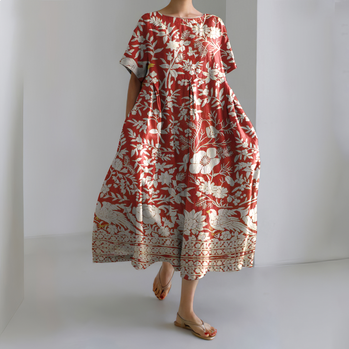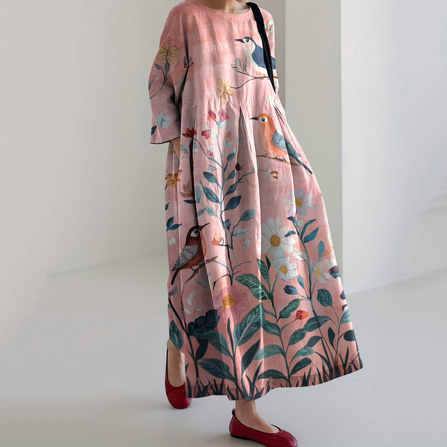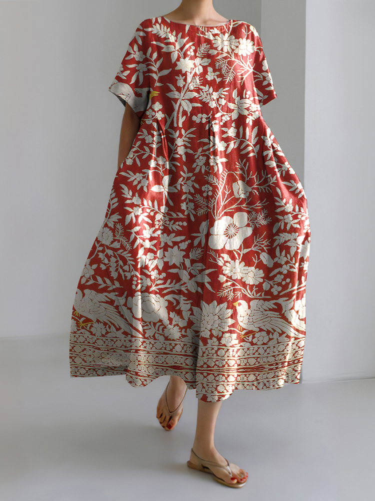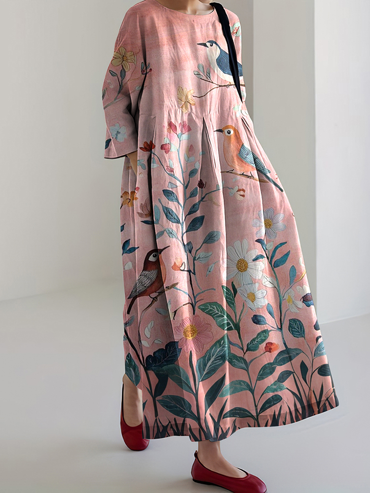 Japanese Floral And Bird Art Print Round Neck Loose Midi Dress