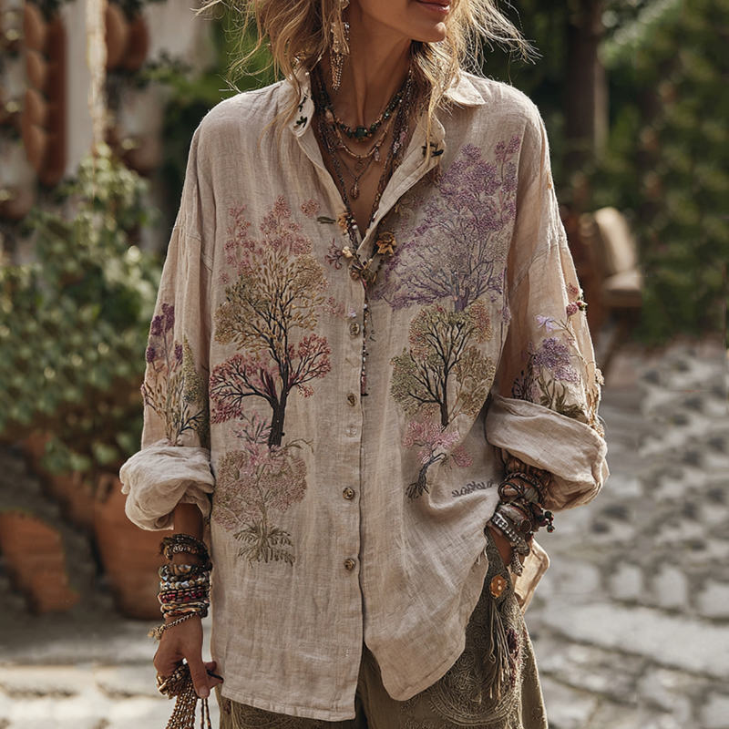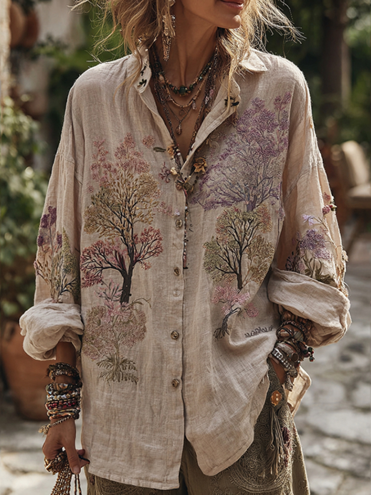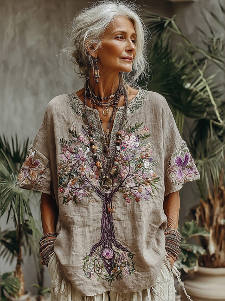 Women's Floral Embroidery Art V Neck Comfy Shirt