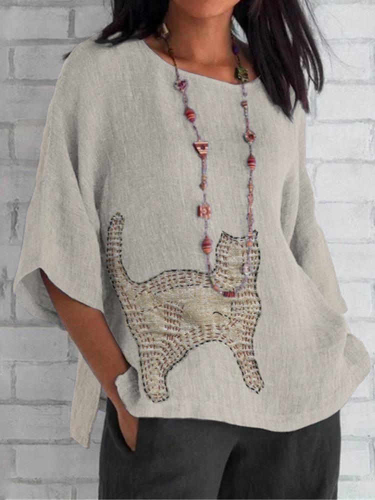 Women's Cat Patch Sashiko Embroidery Art Loose Crew Neck Tops