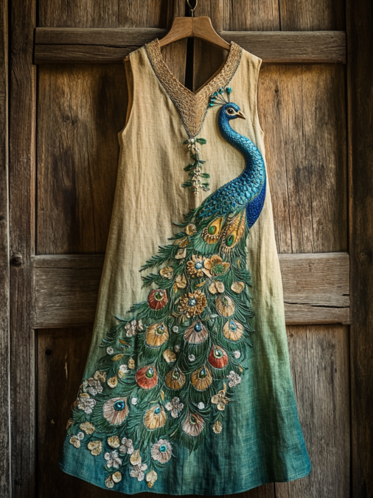 Vintage Peacock And Floral Embroidery In Gradient Pattern Sleeveless Midi Dress