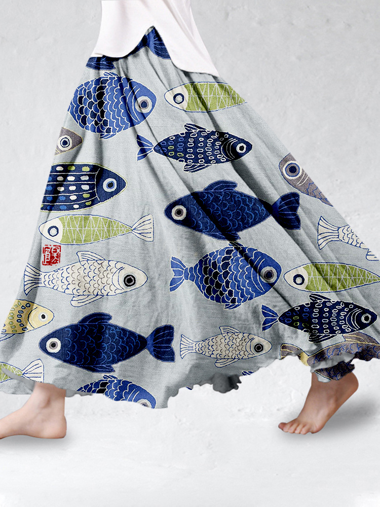 Vintage Fish Japanese Art Linen Blend Flowy Wide Skirt