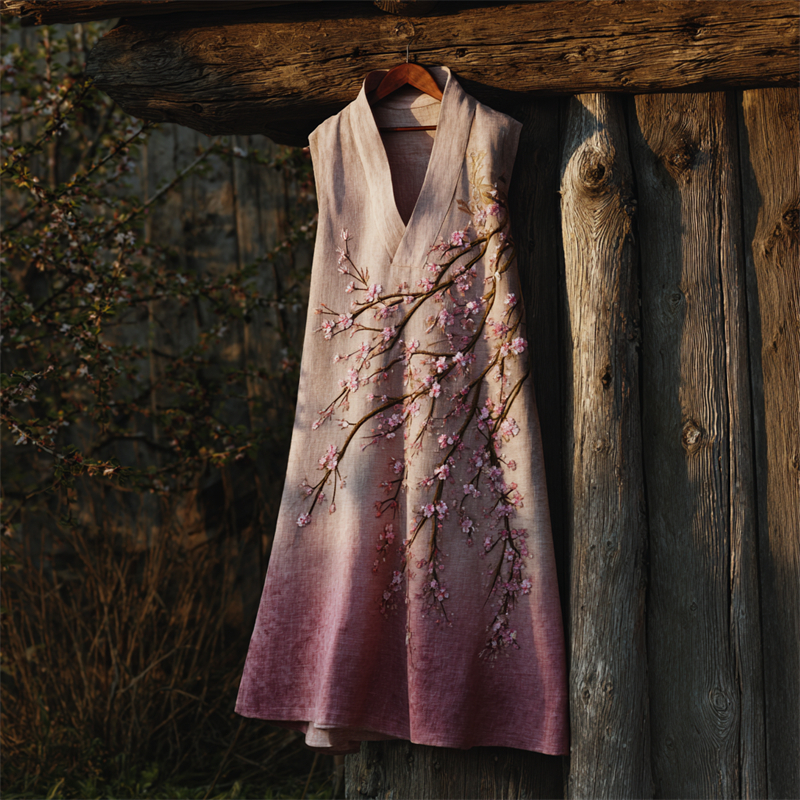 Japanese Cherry Blossom Embroidered Gradient Linen Dress
