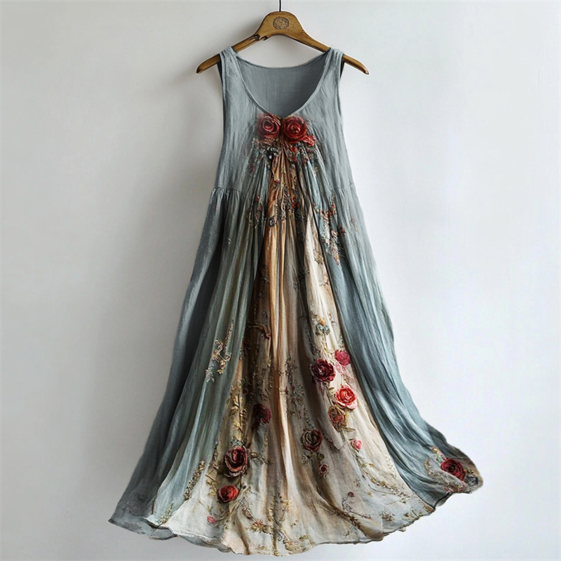 Vintage Roses Floral Flowy Linen Maxi Tank Dress