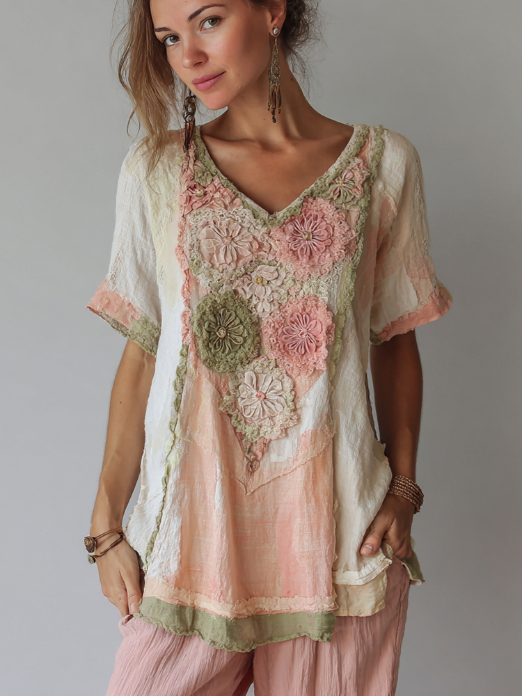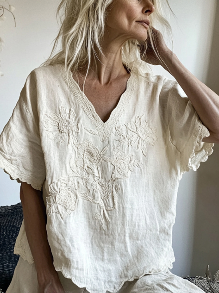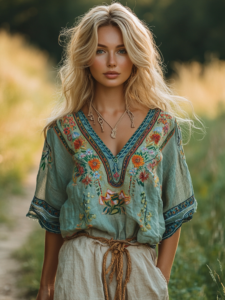 Vintage Embroidered Floral V-neck Linen Blend Blouse