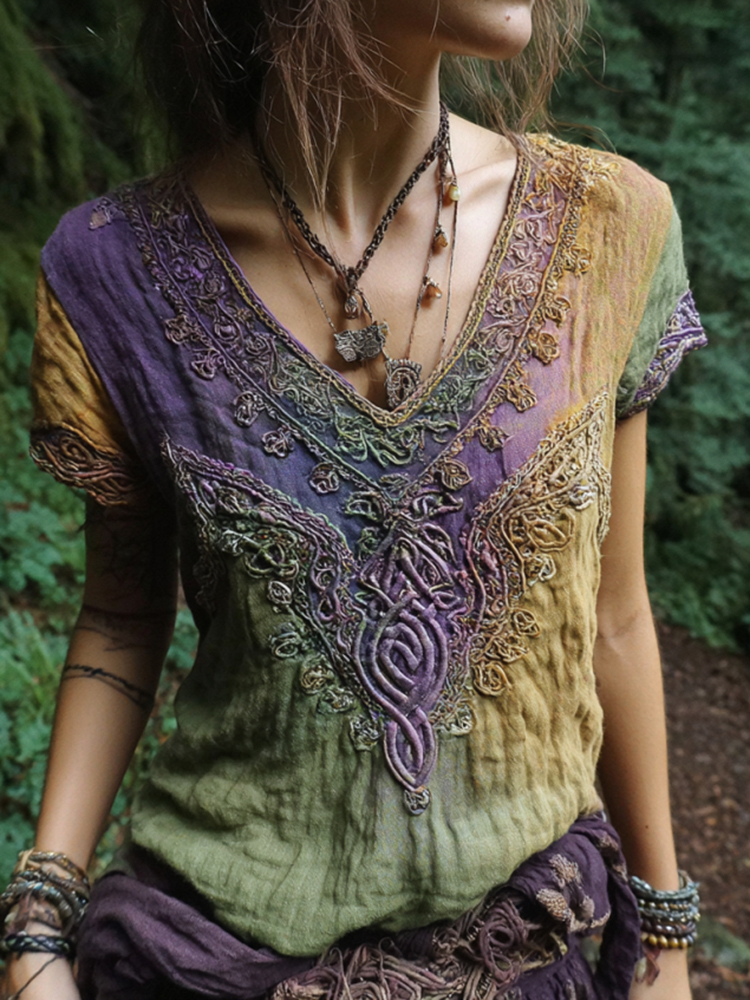 Women's Vintage Floral Art Embroidery Linen T-shirt