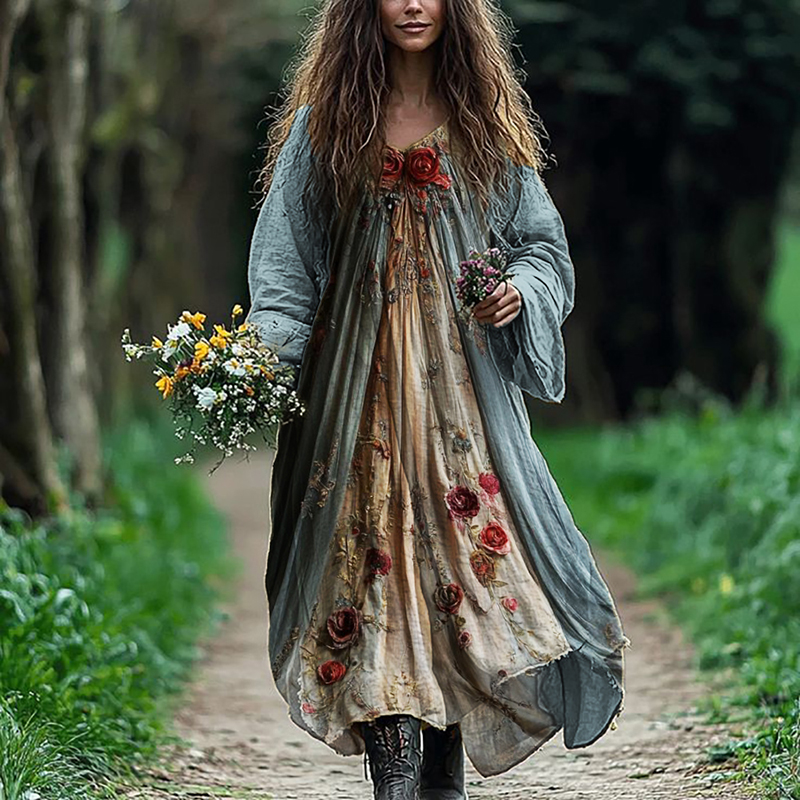 Vintage Roses Floral Flowy Linen Blend Maxi Dress