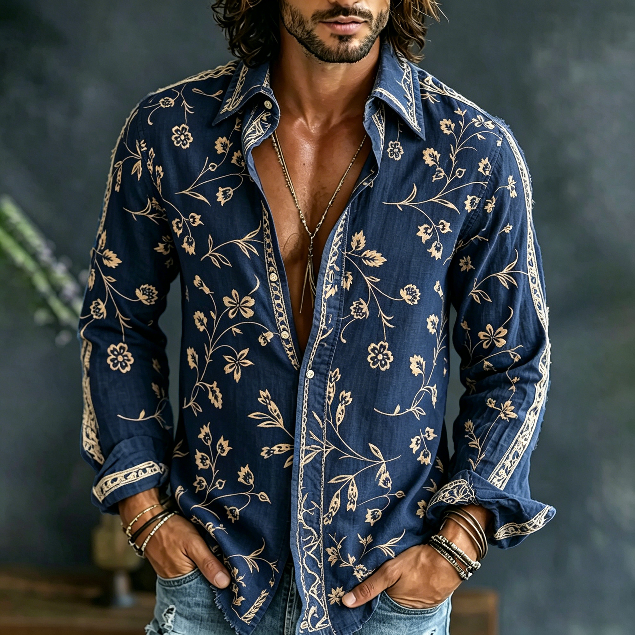 Men's Retro Bohemian Floral Print Casual Linen Shirt