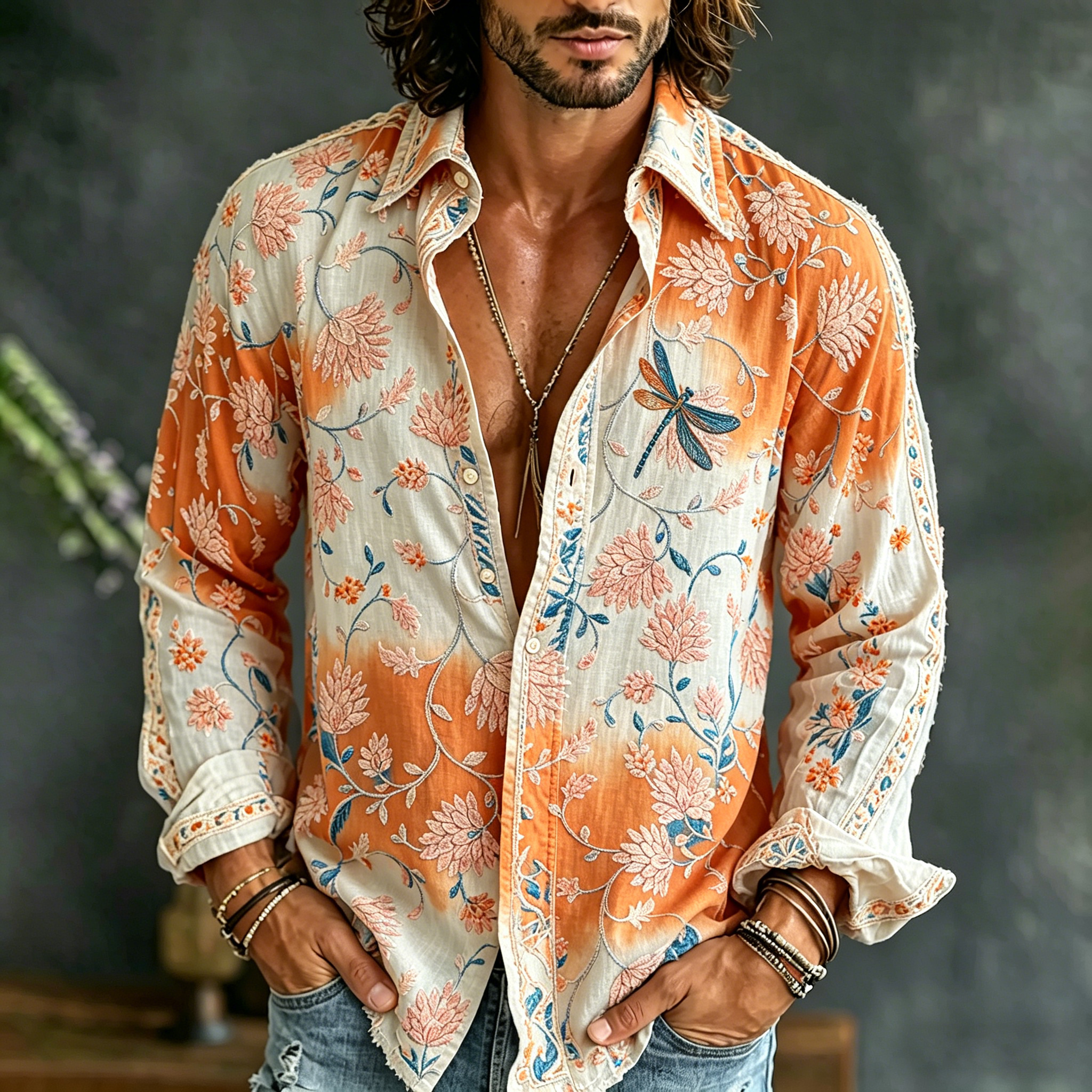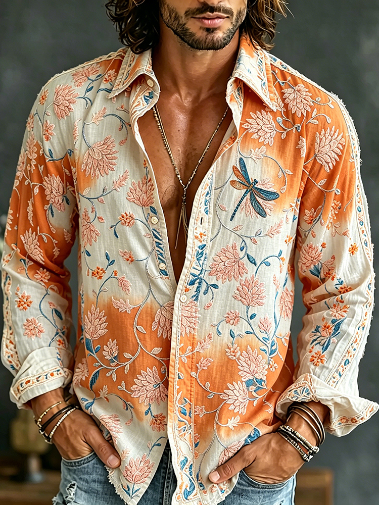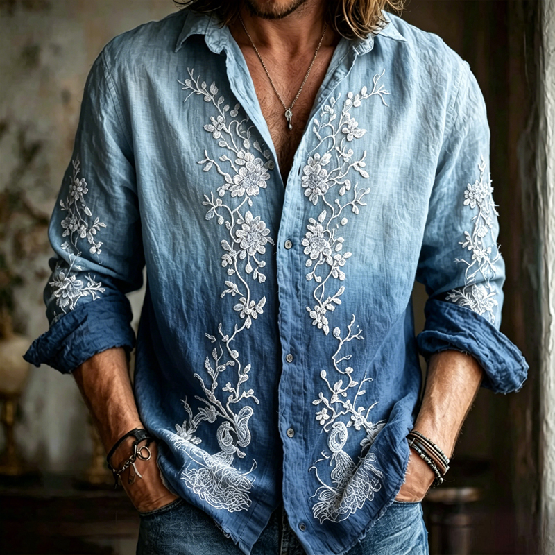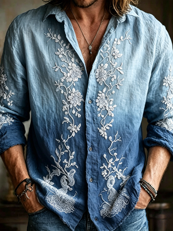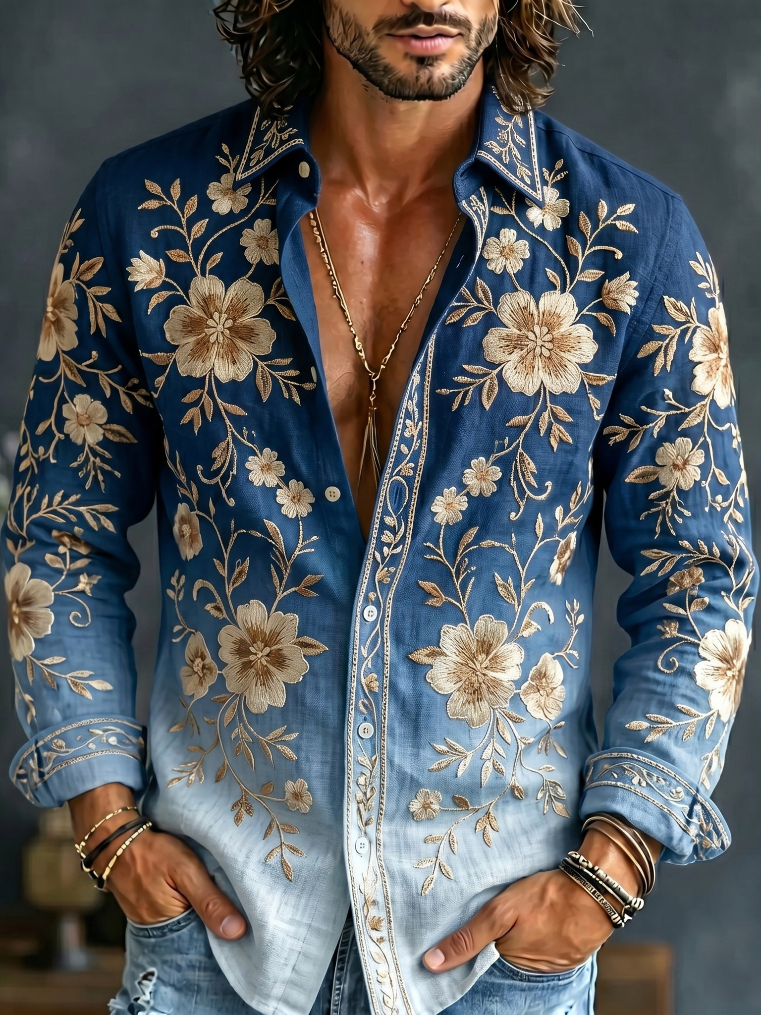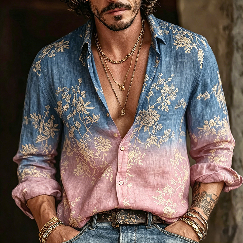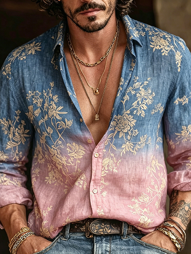 Men's Retro Floral Print Gradient Long Sleeve Linen Blend Shirt