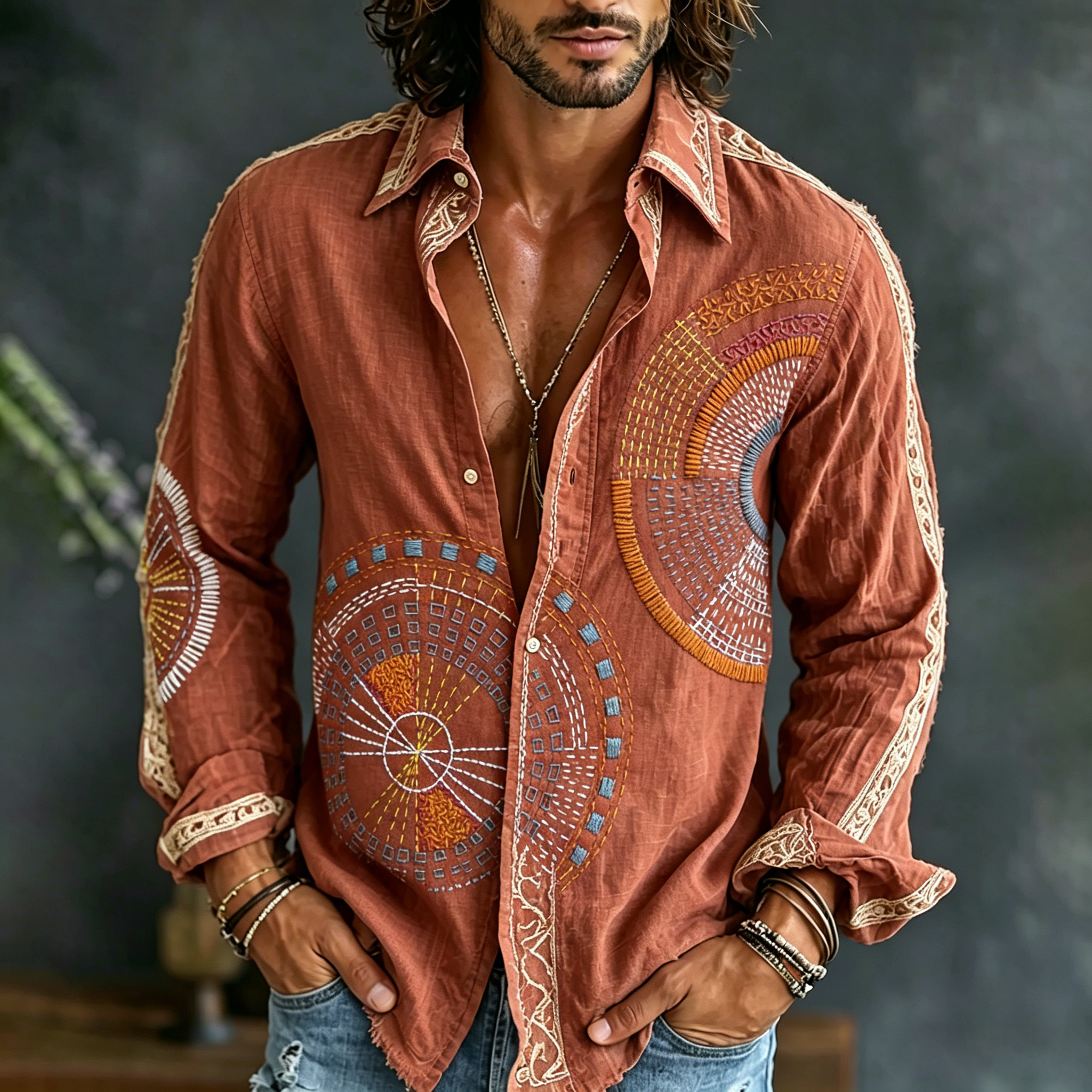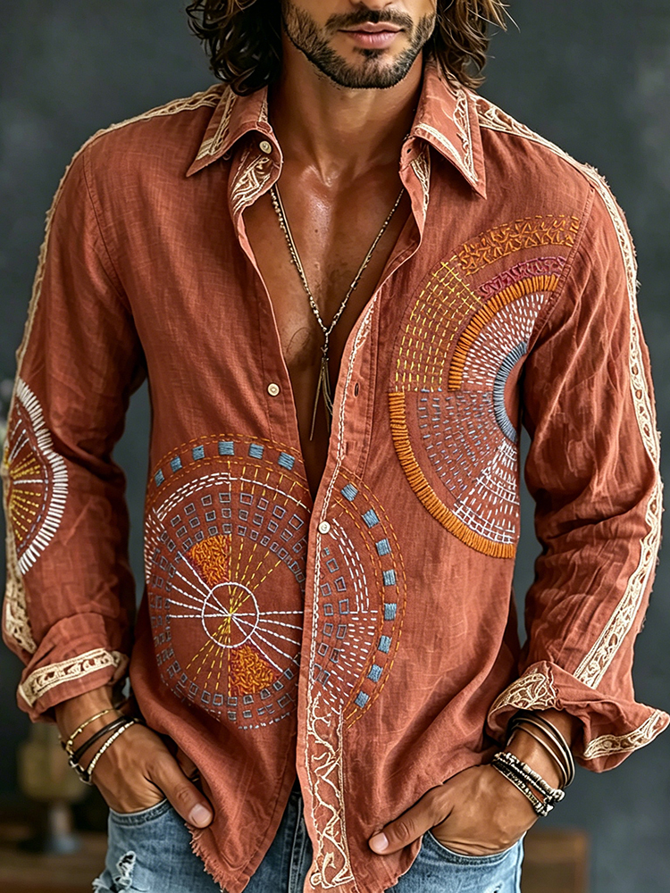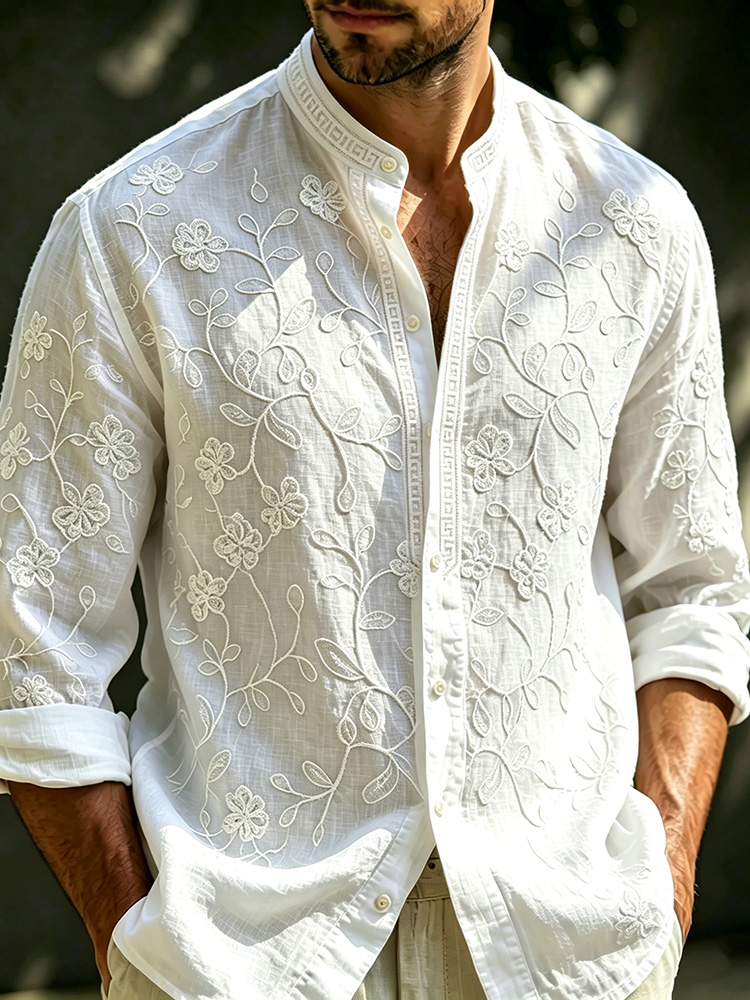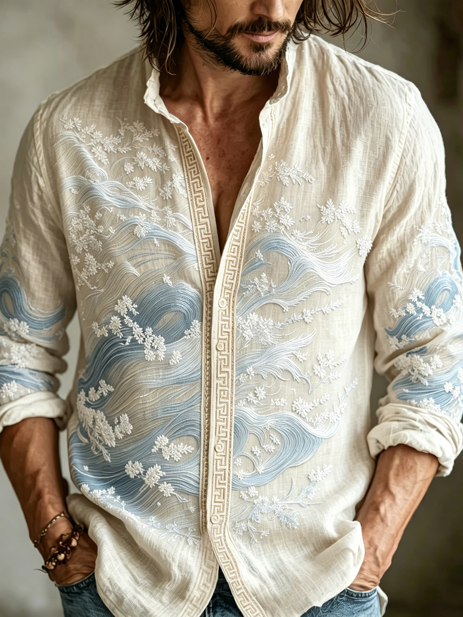 Men's Retro Texture Embroidered Art Print Flowy Linen Blend Shirt