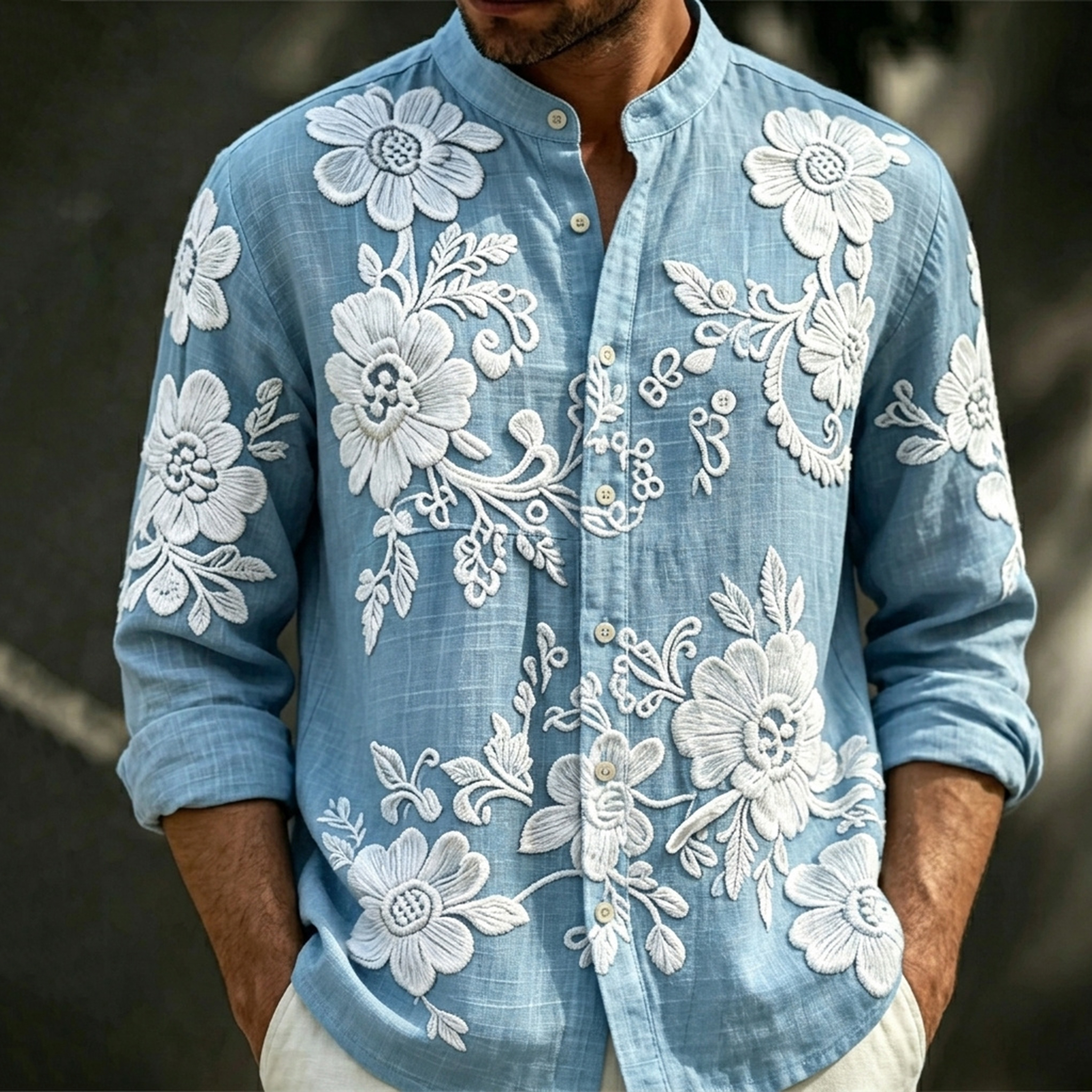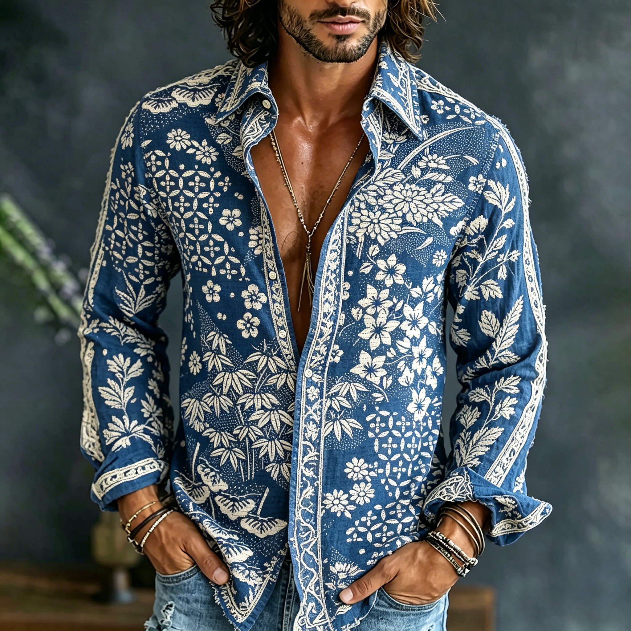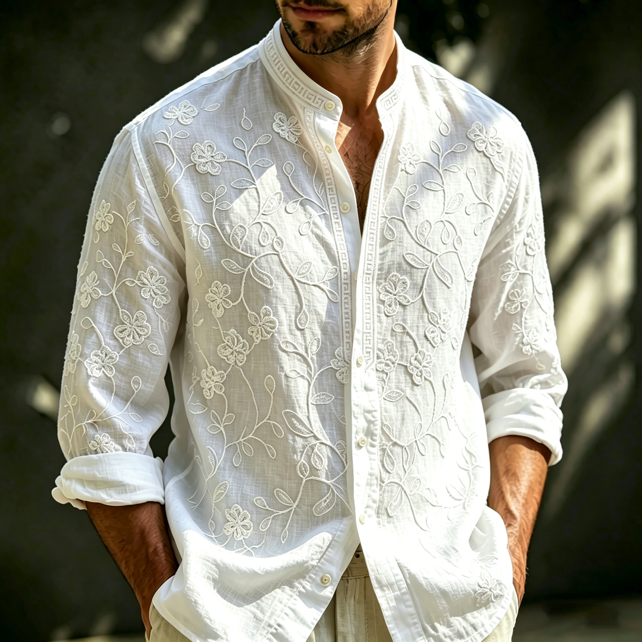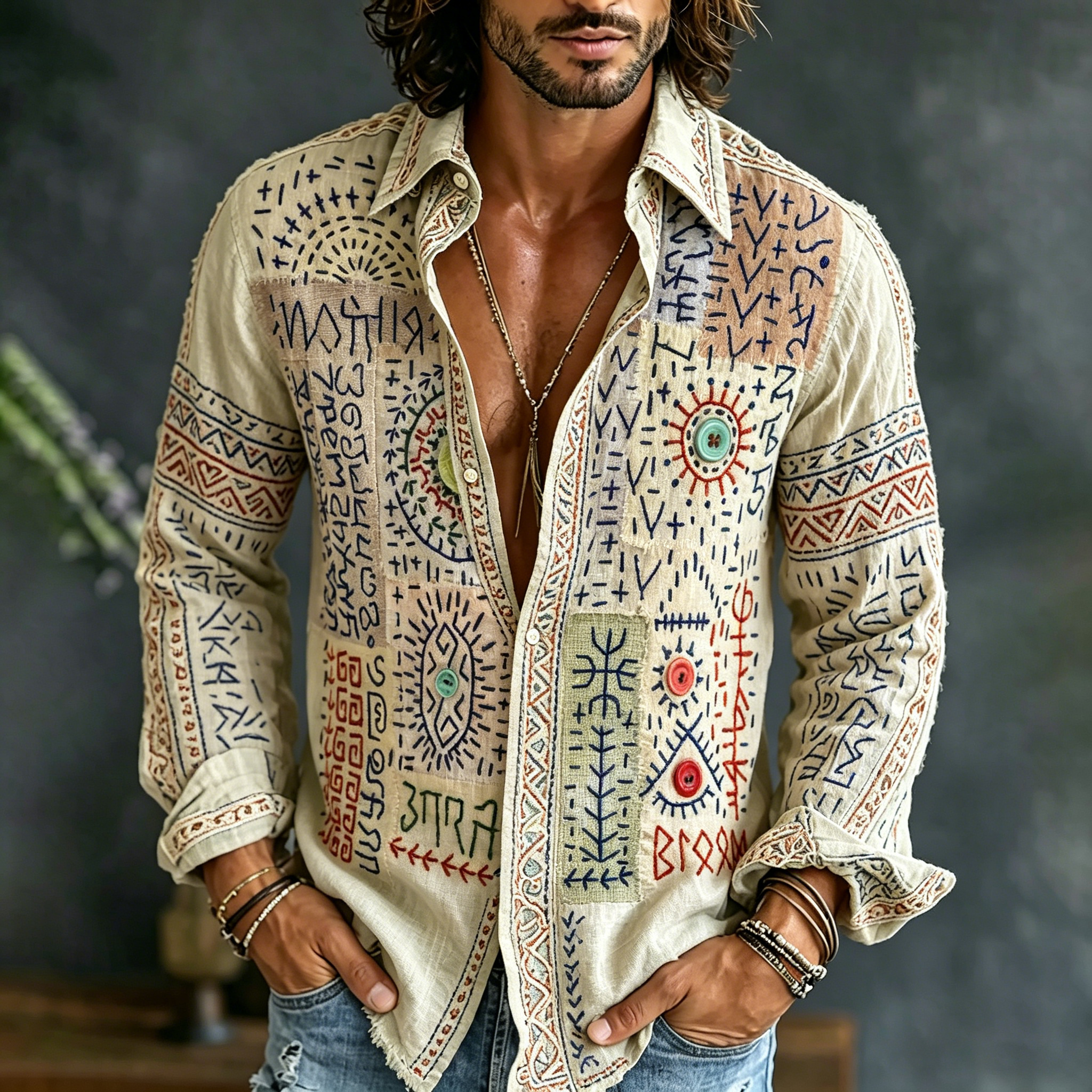 Men's Retro Texture Embroidered Art Print Flowy Linen Blend Shirt