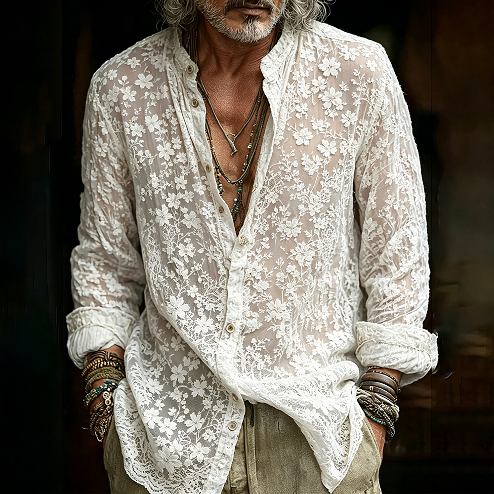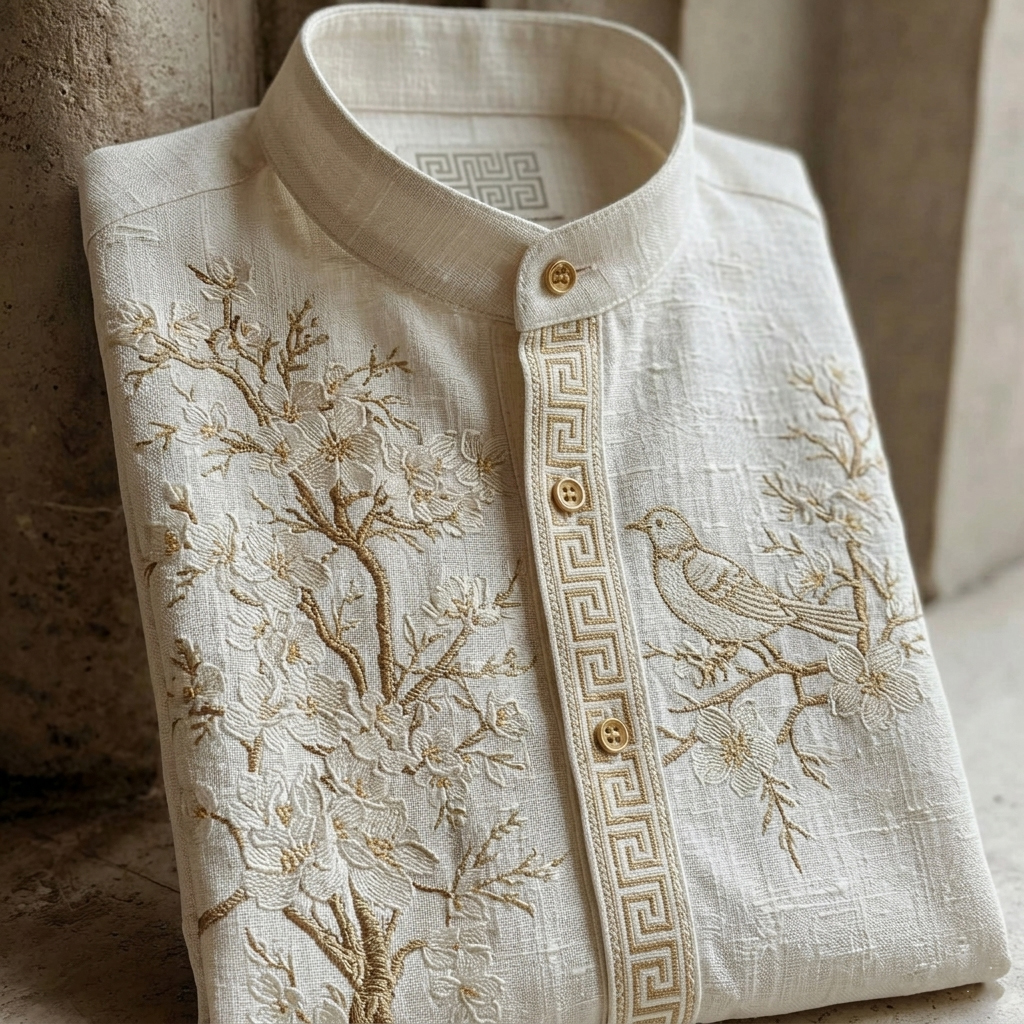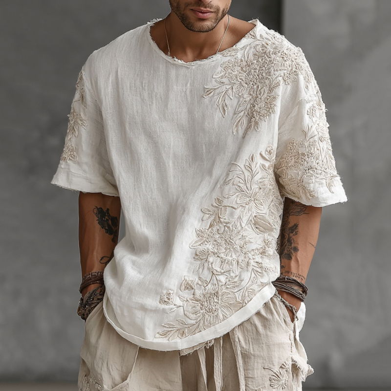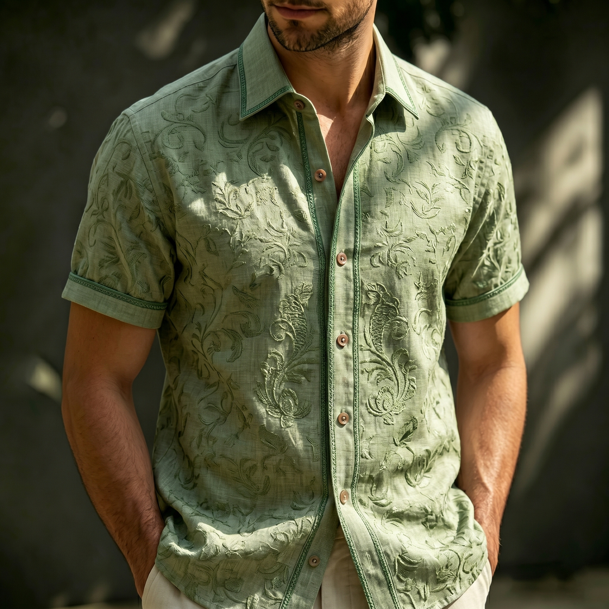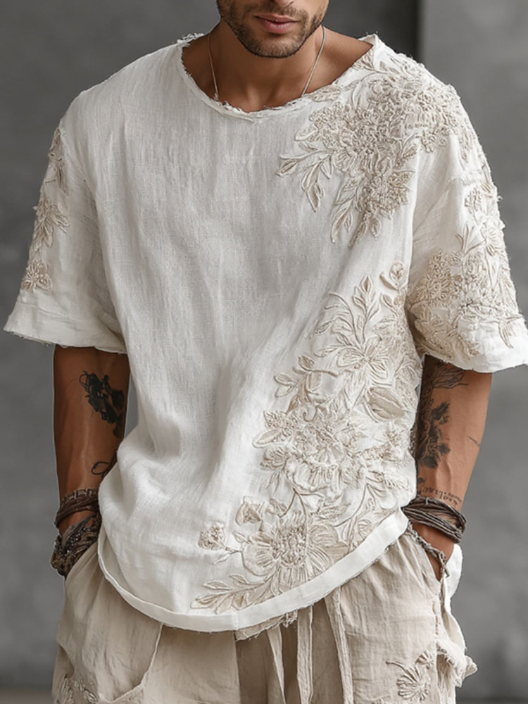 Men's Retro Texture Embroidered Art Print Flowy Linen Blend Shirt