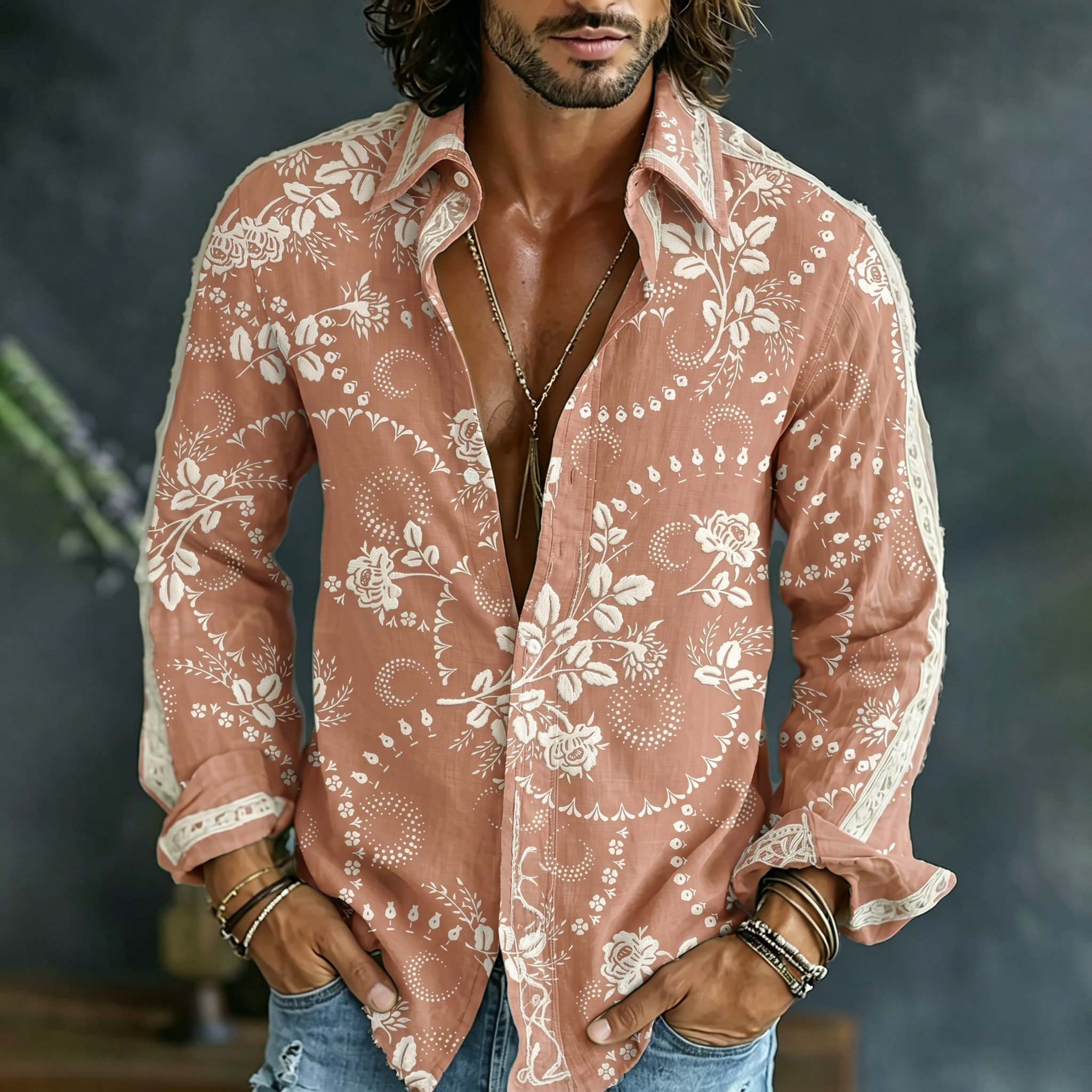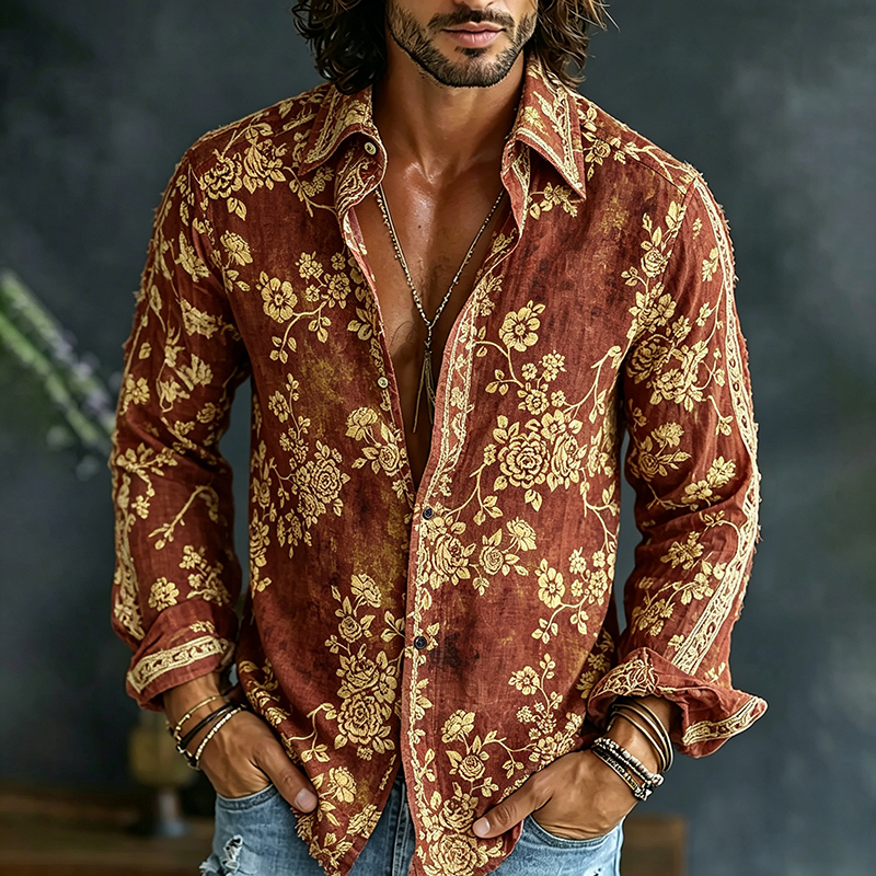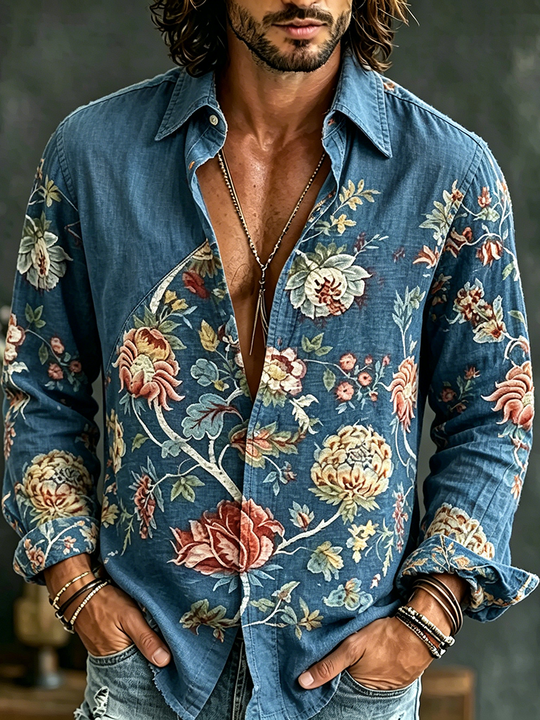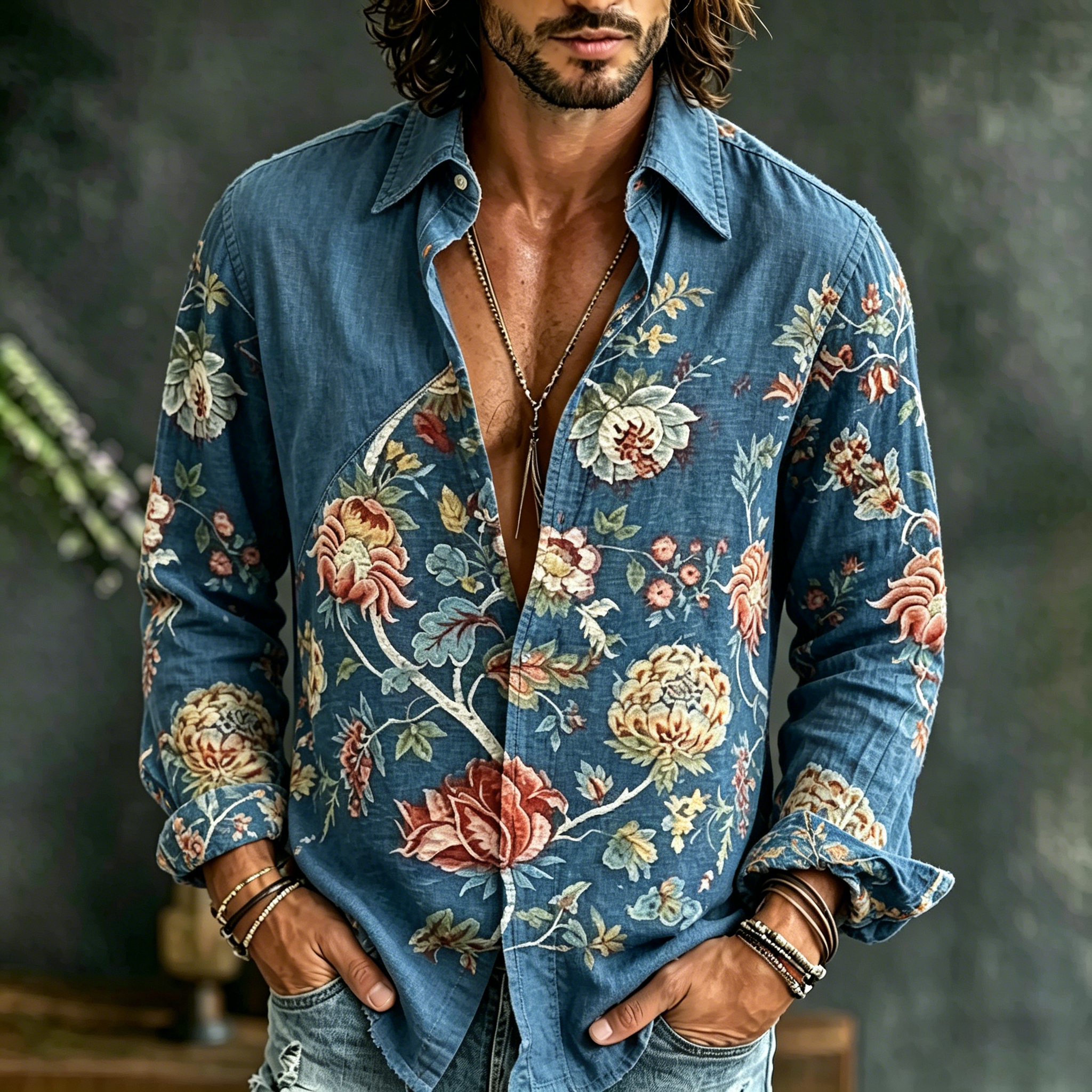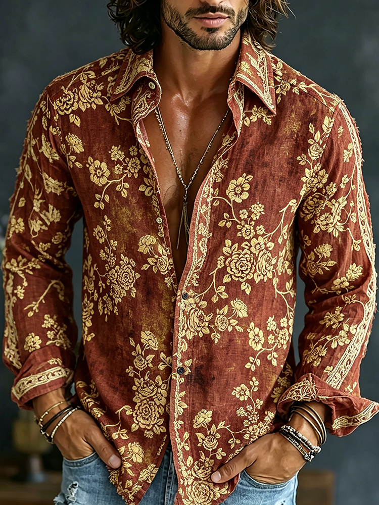 Men's Vintage Floral Art Print Long Sleeve Linen Blend Casual Shirt