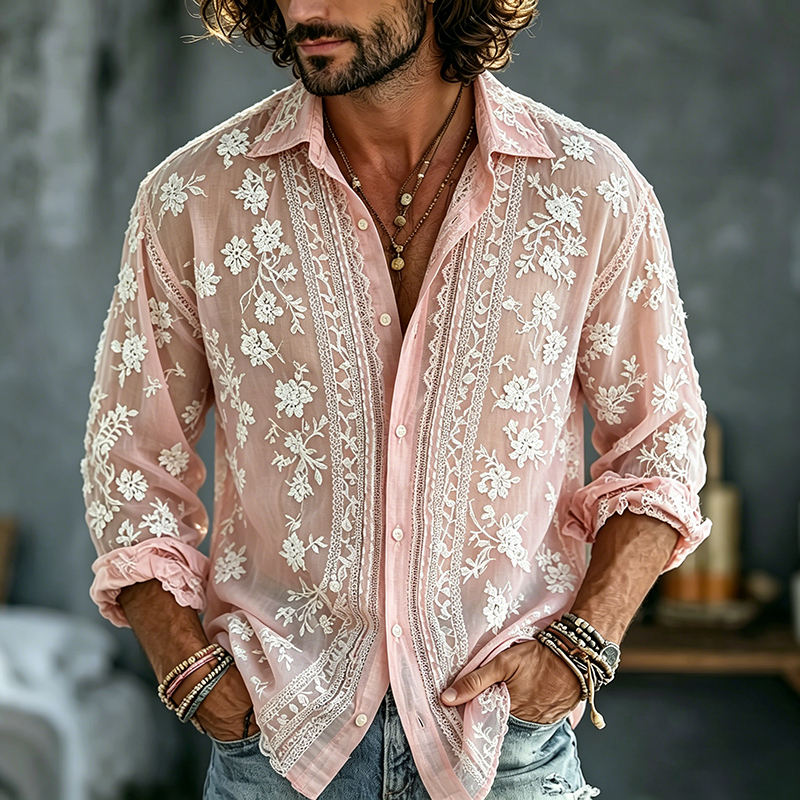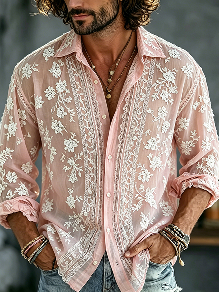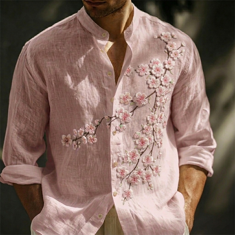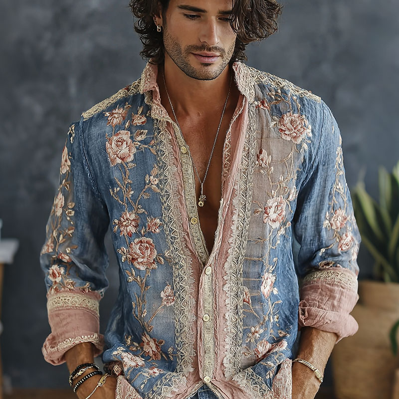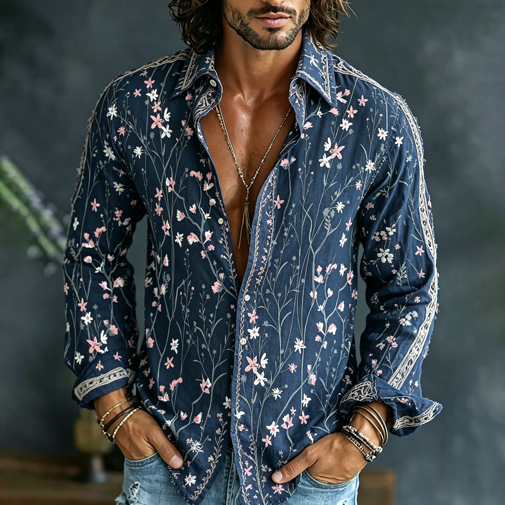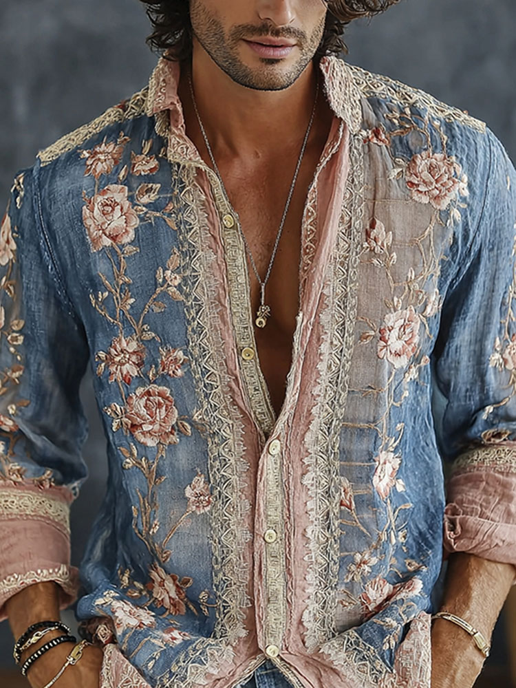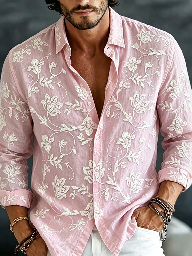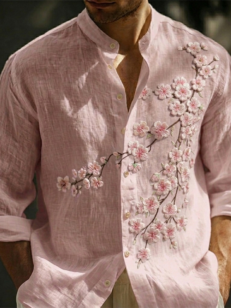 Men's Vintage Spring Floral Embroidered Art Print Flowy Linen Blend Casual Shirt