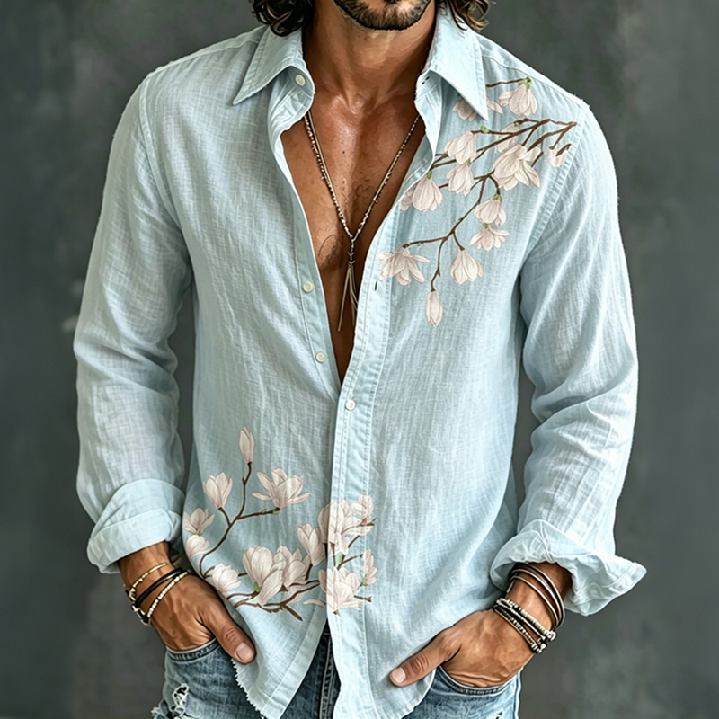 Vintage Magnolia Art Print Casual Cotton Shirt