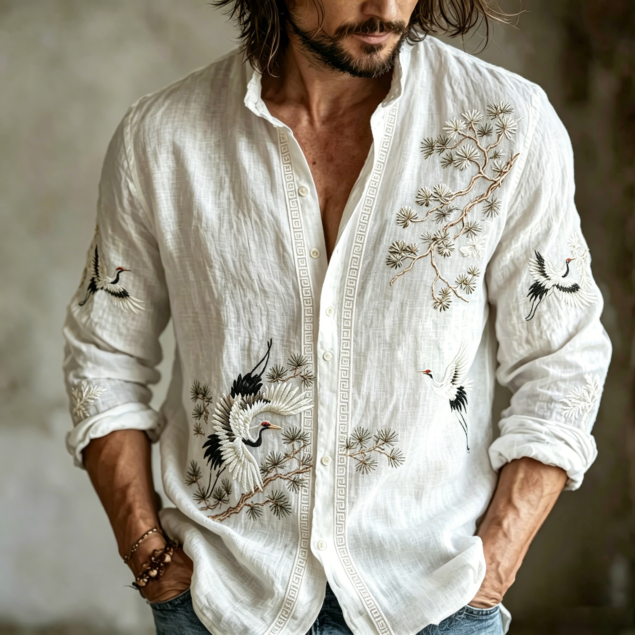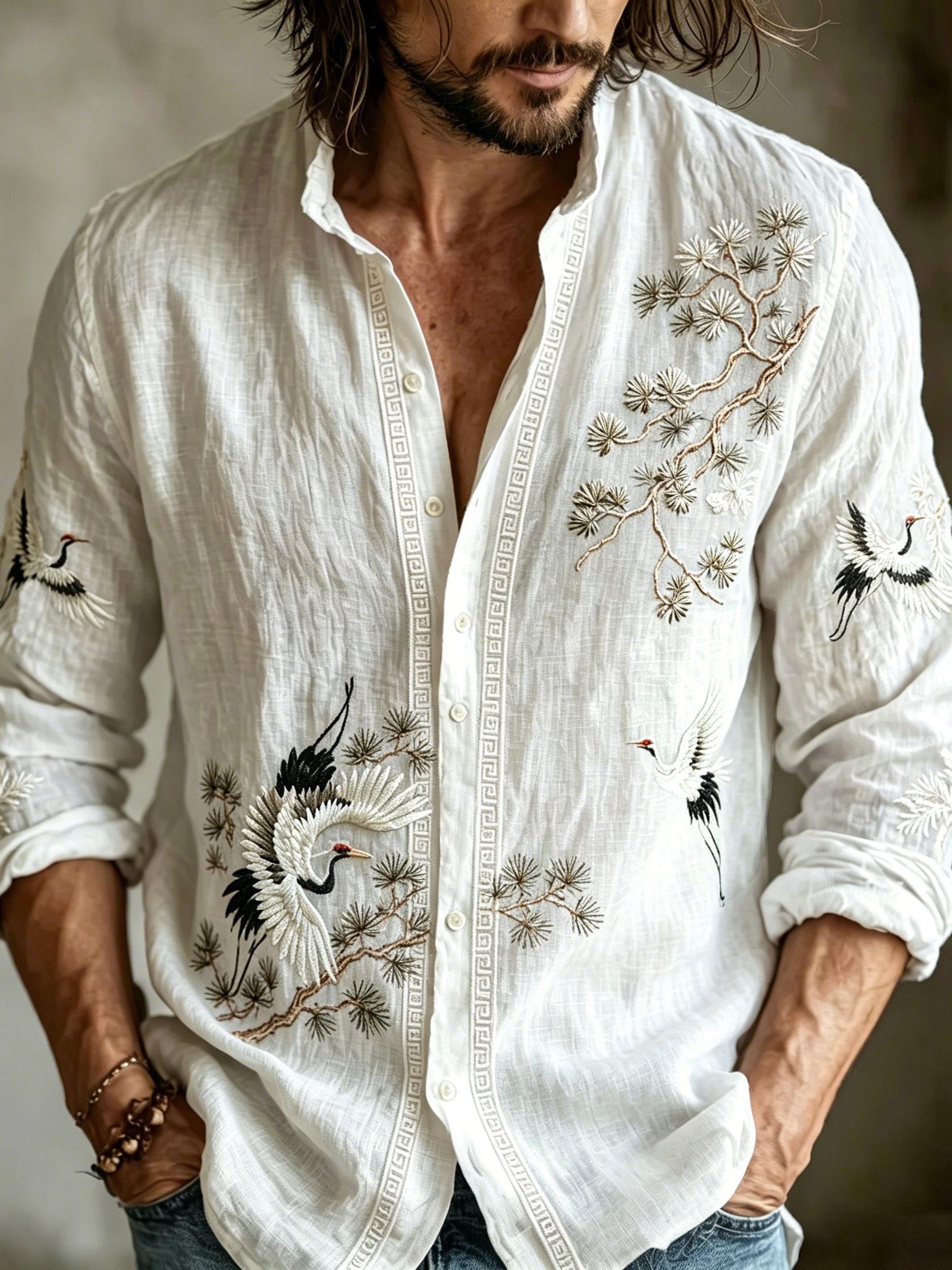 Vintage Cranes And Pine Trees Linen Blend Long Sleeve Shirt