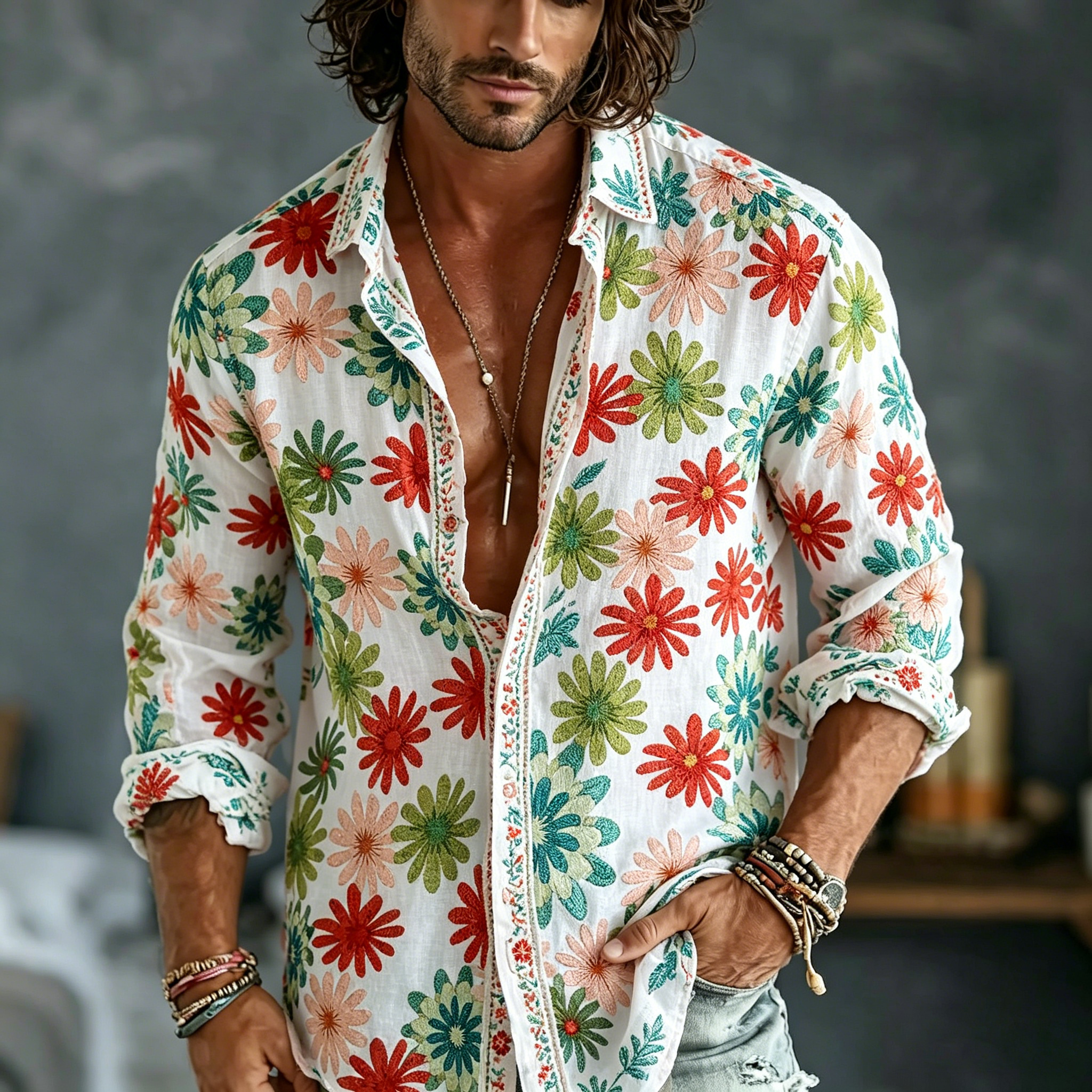 Men's Spring Summer Colorful Floral Embroidered Art Print Flowy Linen Blend Shirt