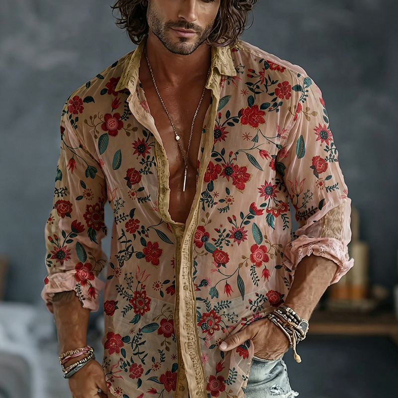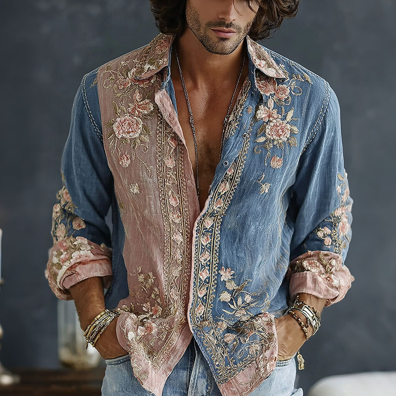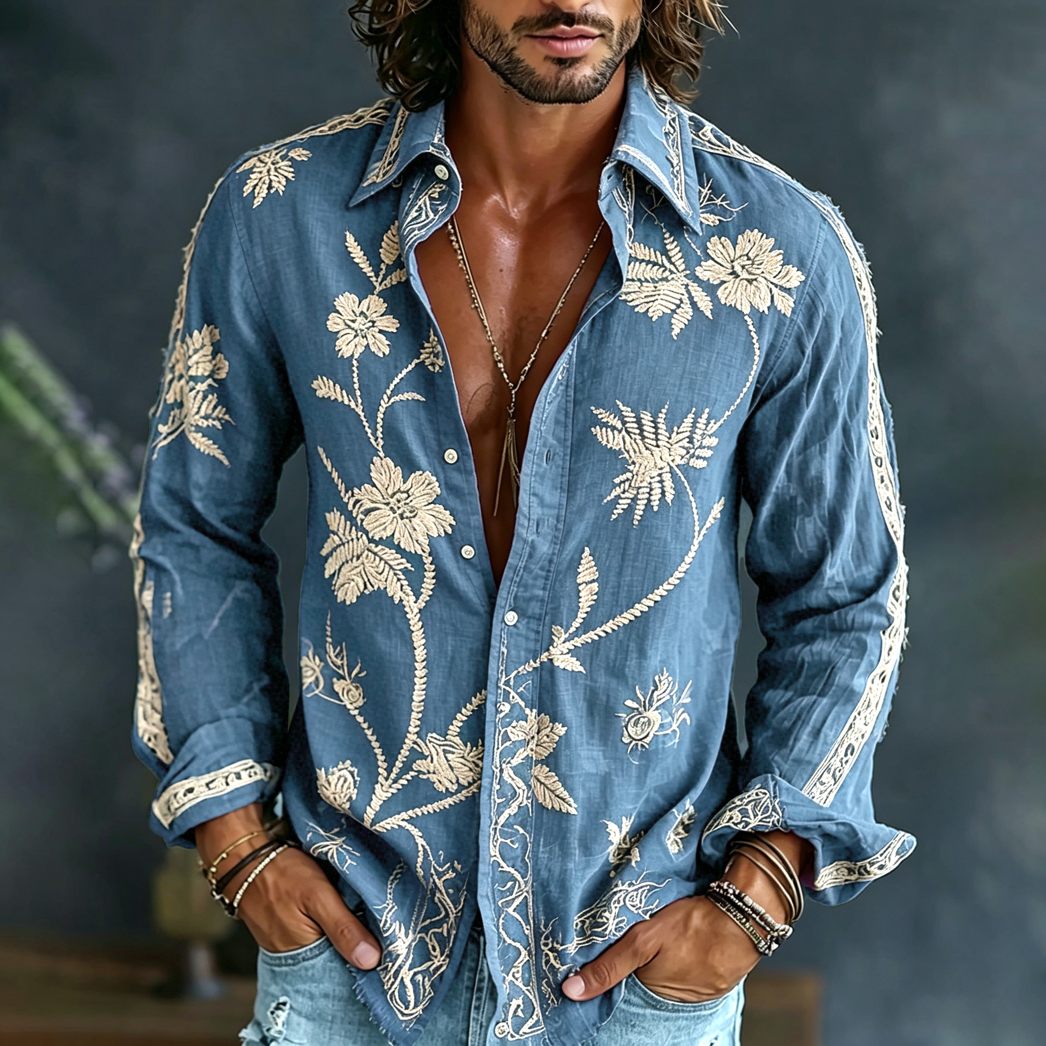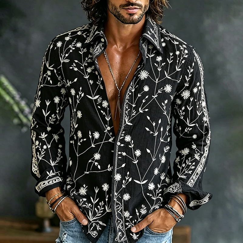 Men's Retro Floral Embroidered Art Print Flowy Linen Blend Shirt